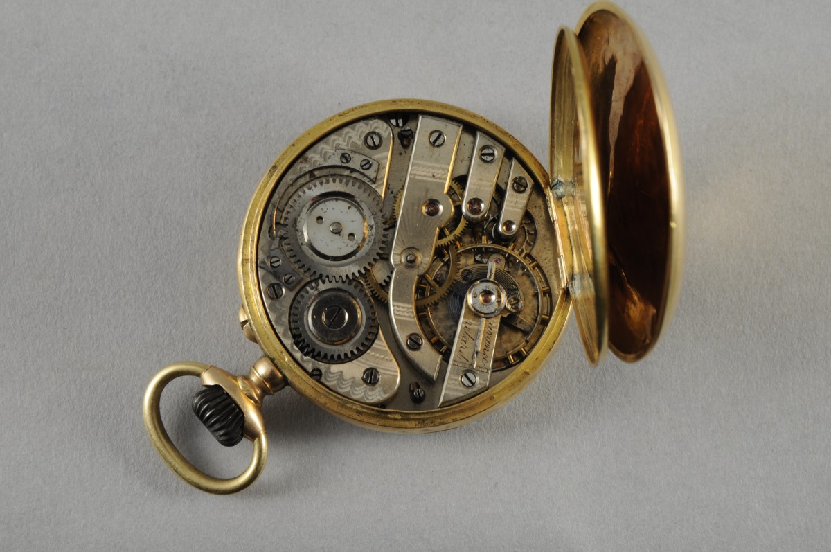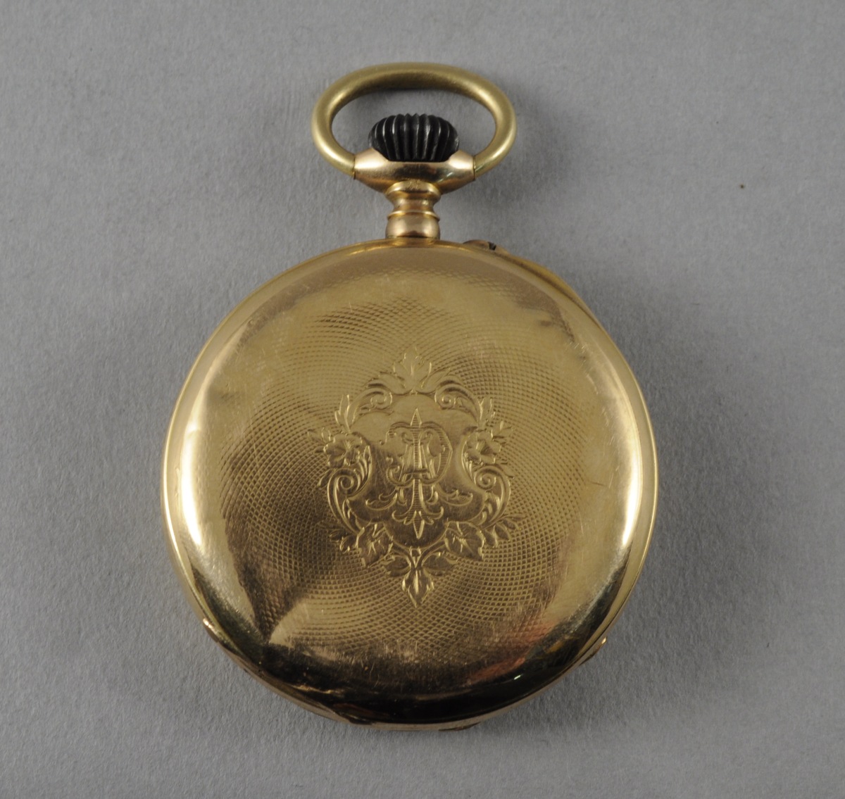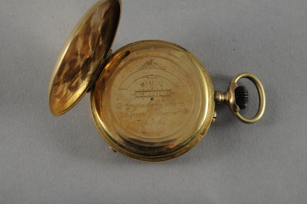 MONTRE DE GOUSSET en or jaune à remontoir au pendant. Cadran double émaillé blanc indiquant les heures en chiffres romains, les minutes en chiffres arabes et les secondes. Le dos du boîtier ciselé d'un écusson monogrammé "PA" entouré de rinceaux feuillagés sur fond de guillochis. Le cache-poussière gravé "N°85062 / Remontoir / Ancre ligne droite / Spiral Breguet / 16 rubis".