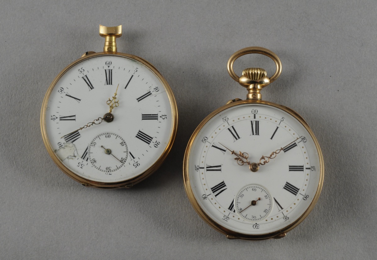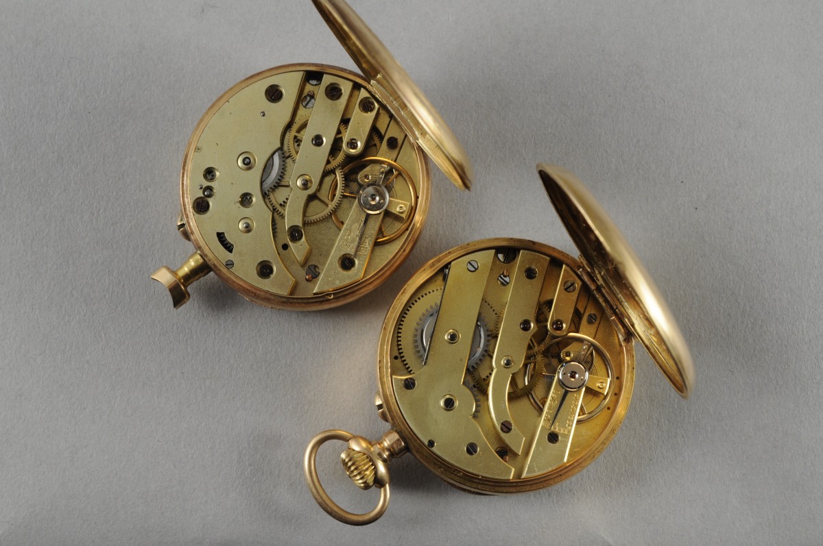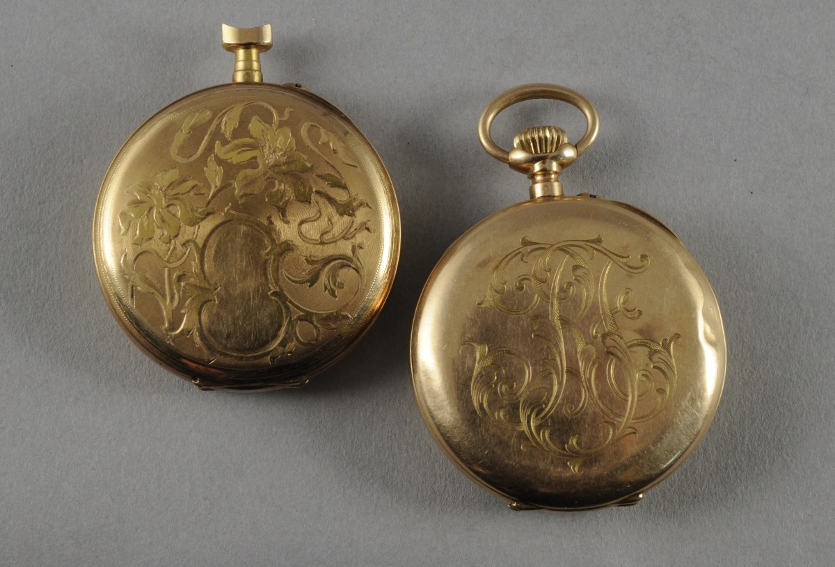 LOT DE 2 MONTRES DE GOUSSET en or jaune à remontoir au pendant.