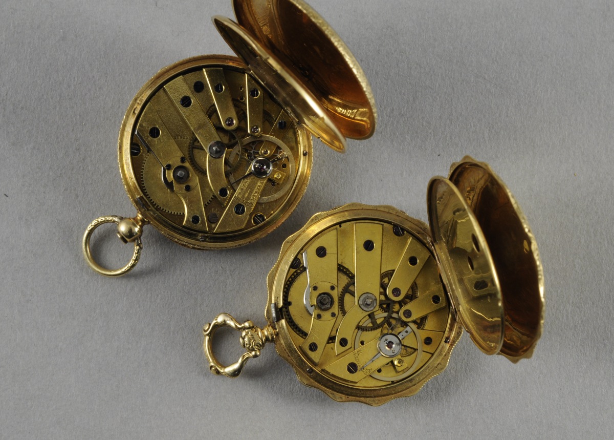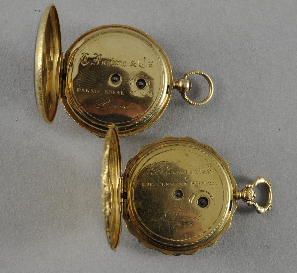 -La première, cadran émaillé blanc indiquant les heures en chiffres romains. Le boîtier, de forme chantournée, est ciselé d'un riche décor vermiculé et de fleurs et feuillages. Cache poussière gravé "J.B. Counis & Fils / rue Grenelle St Hré 29. / à Paris.".