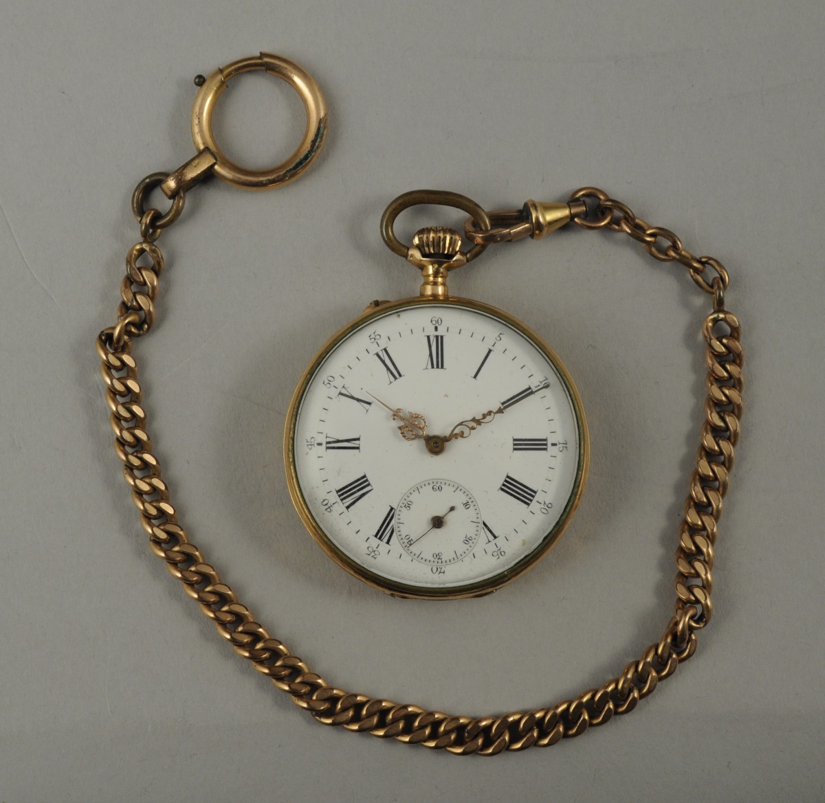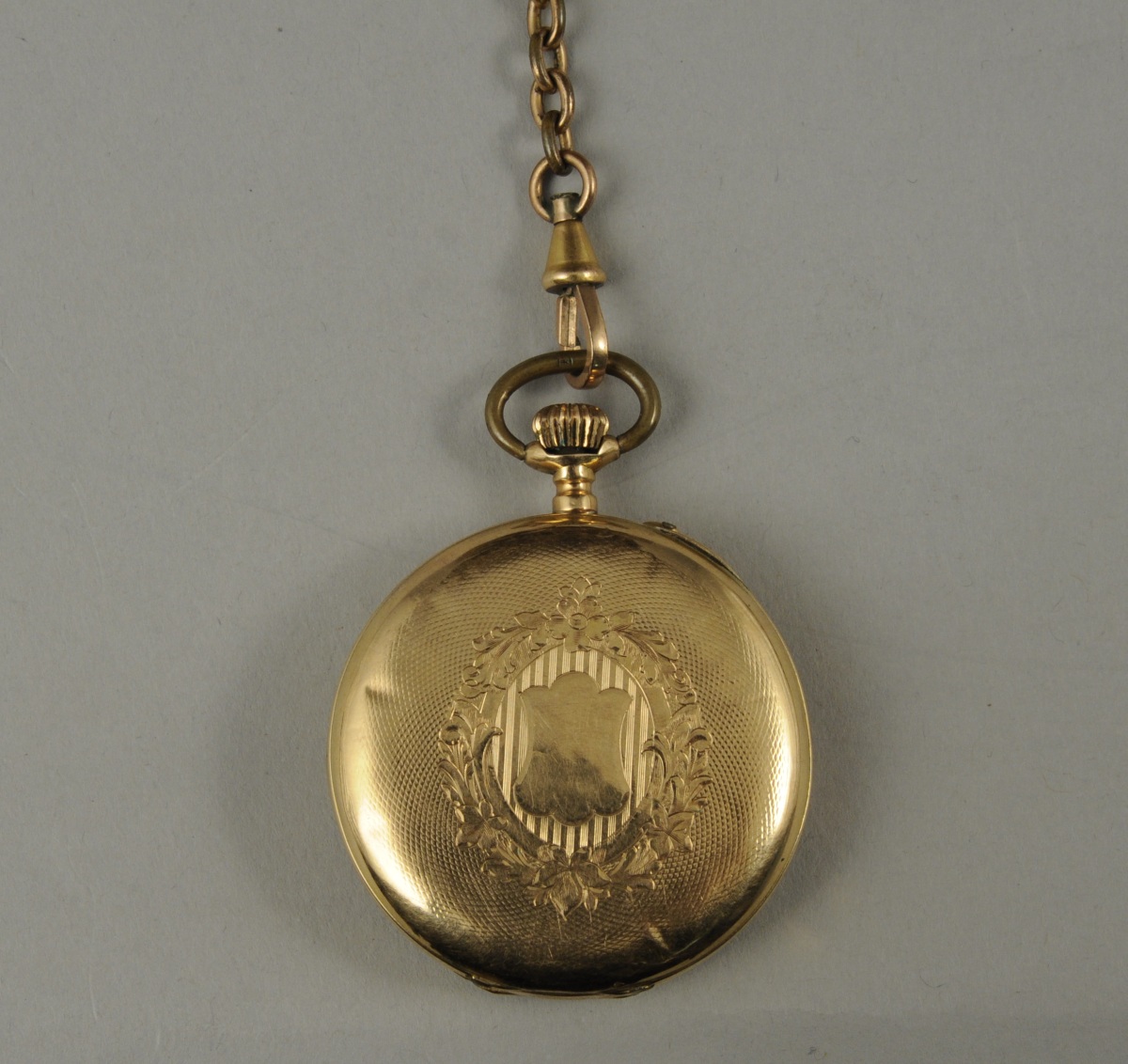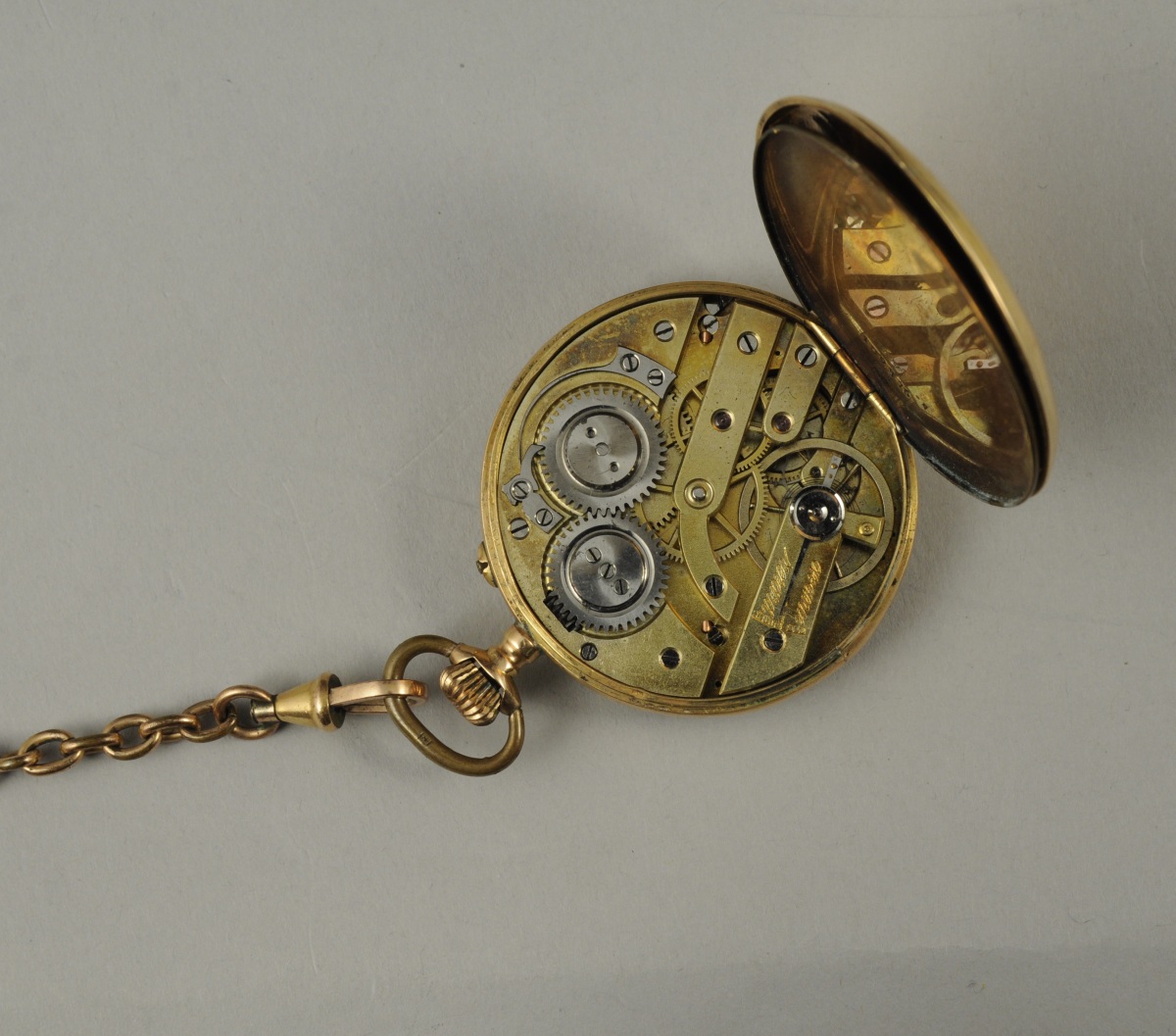MONTRE DE GOUSSET en or, à remontoir au pendant. Double cadran émaillé blanc indiquant les heures en chiffres romains, les minutes en chiffres arabes et les secondes. Couvercle en amati, et cartouche feuillagé avec écusson.