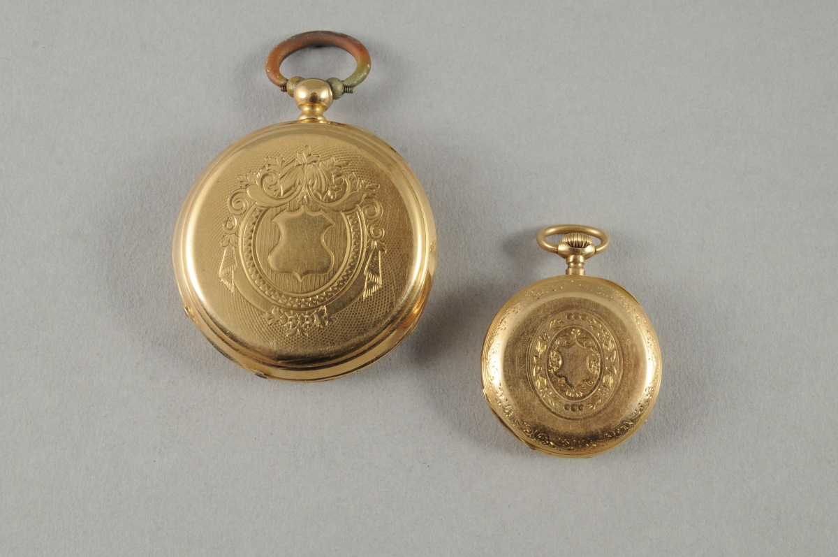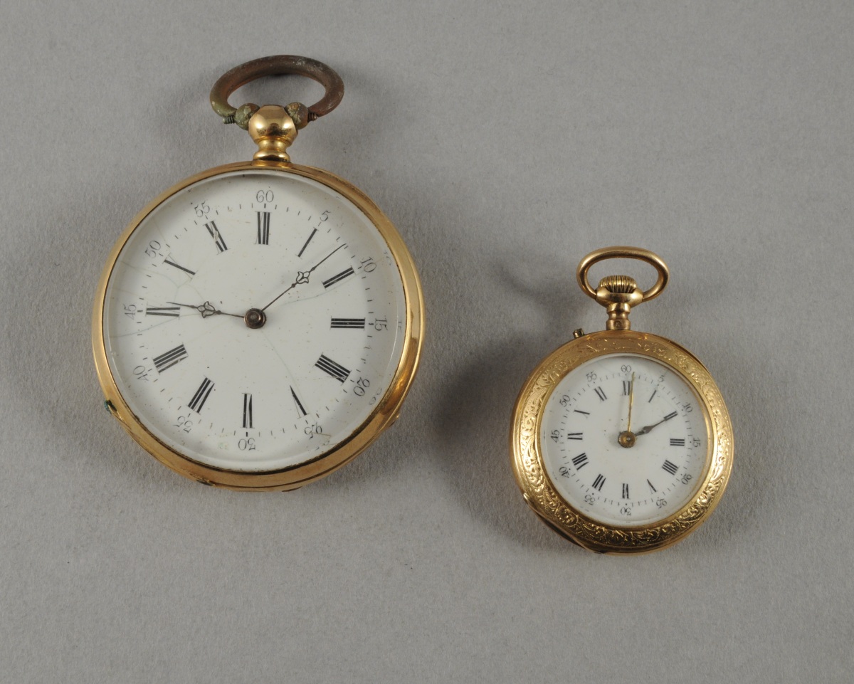 -MONTRE DE GOUSSET à clef. Le cadran émaillé blanc indiquant les heures en chiffres romains et les minutes en chiffres arabes. Le dos du boîtier orné d'un écusson dans un encadrements de feuillages stylisés sur fond guilloché.
