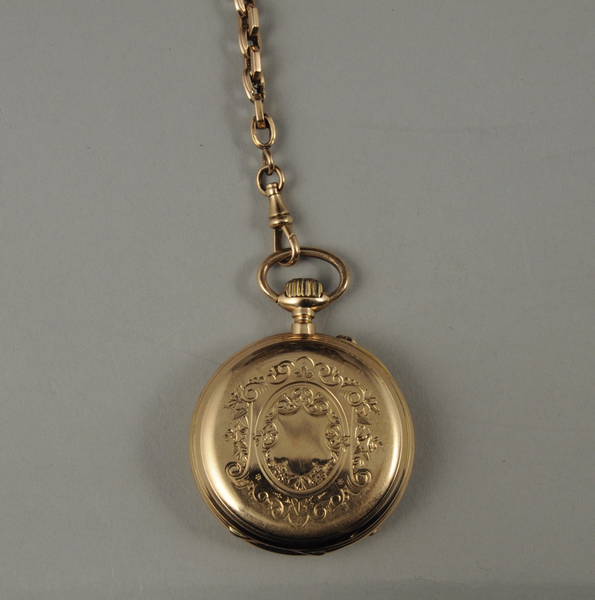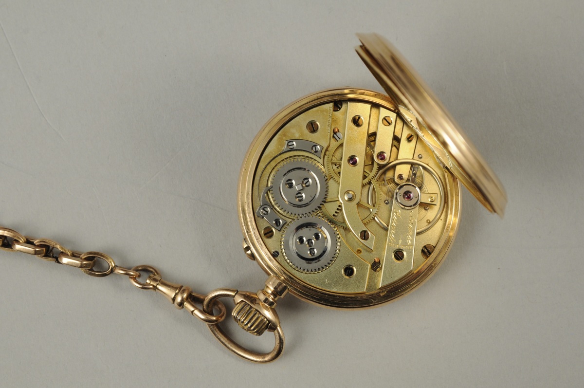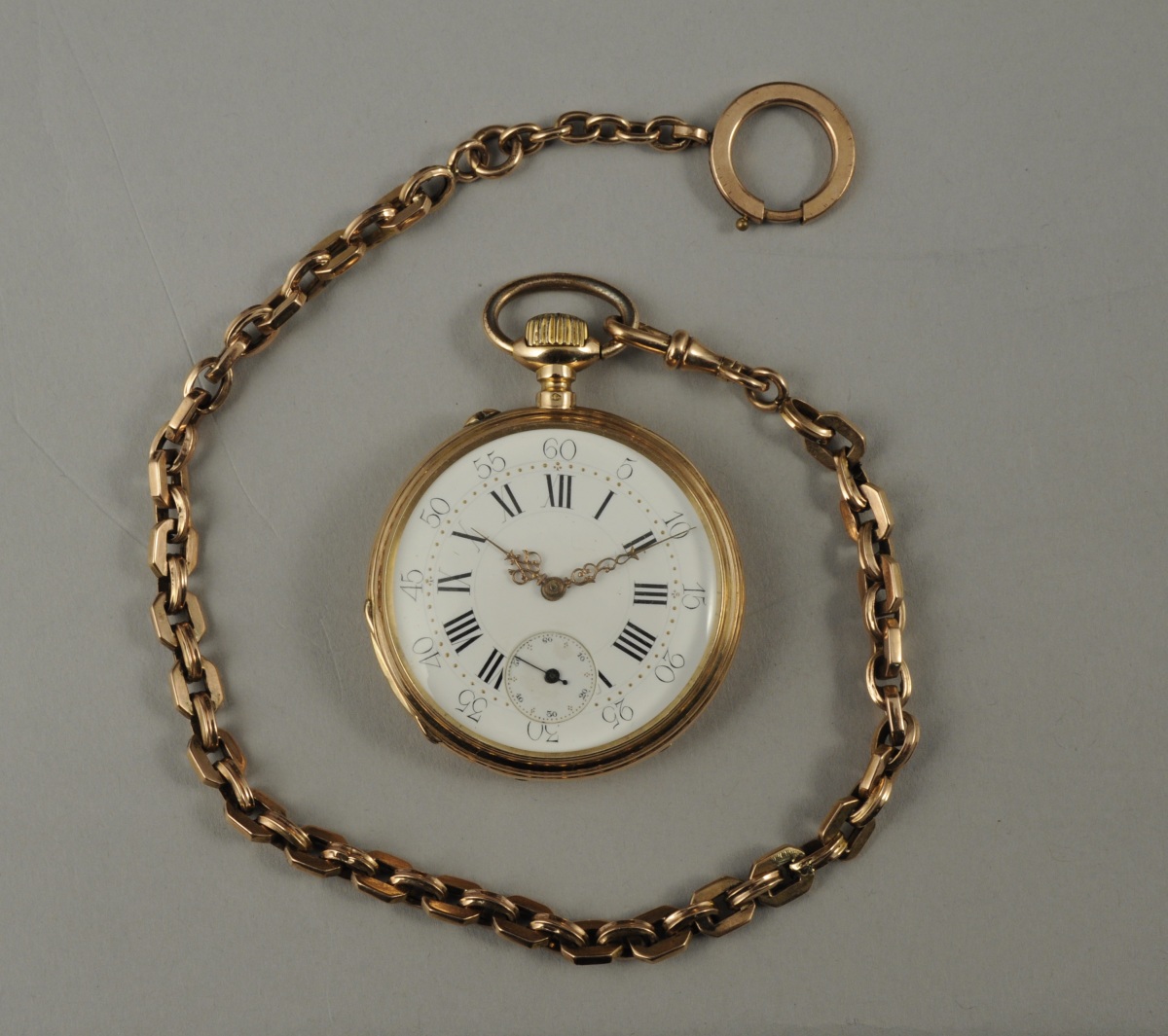 MONTRE DE GOUSSET en or à remontoir. Double cadran émaillé indiquant les heures en chiffres romains, les minutes en chiffres arabes et les secondes. État de marche.