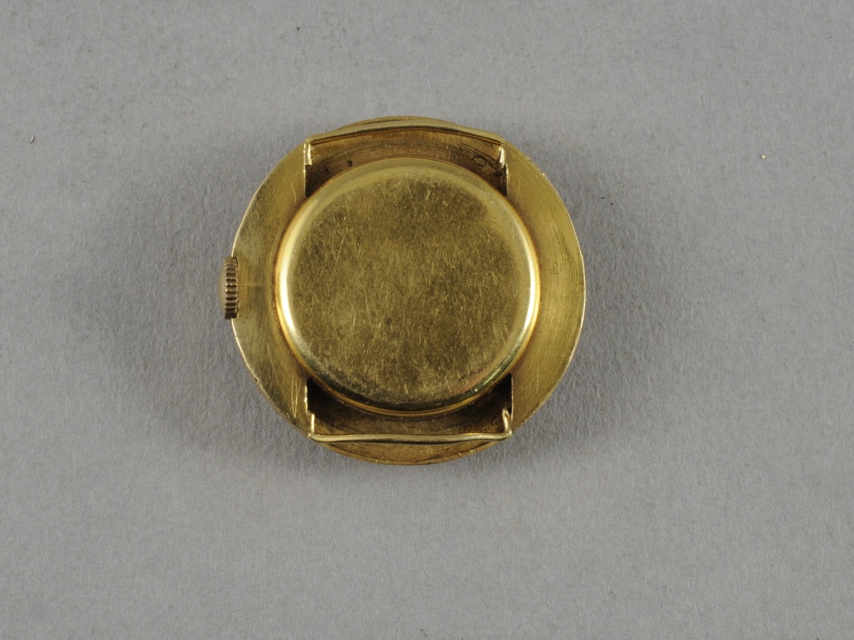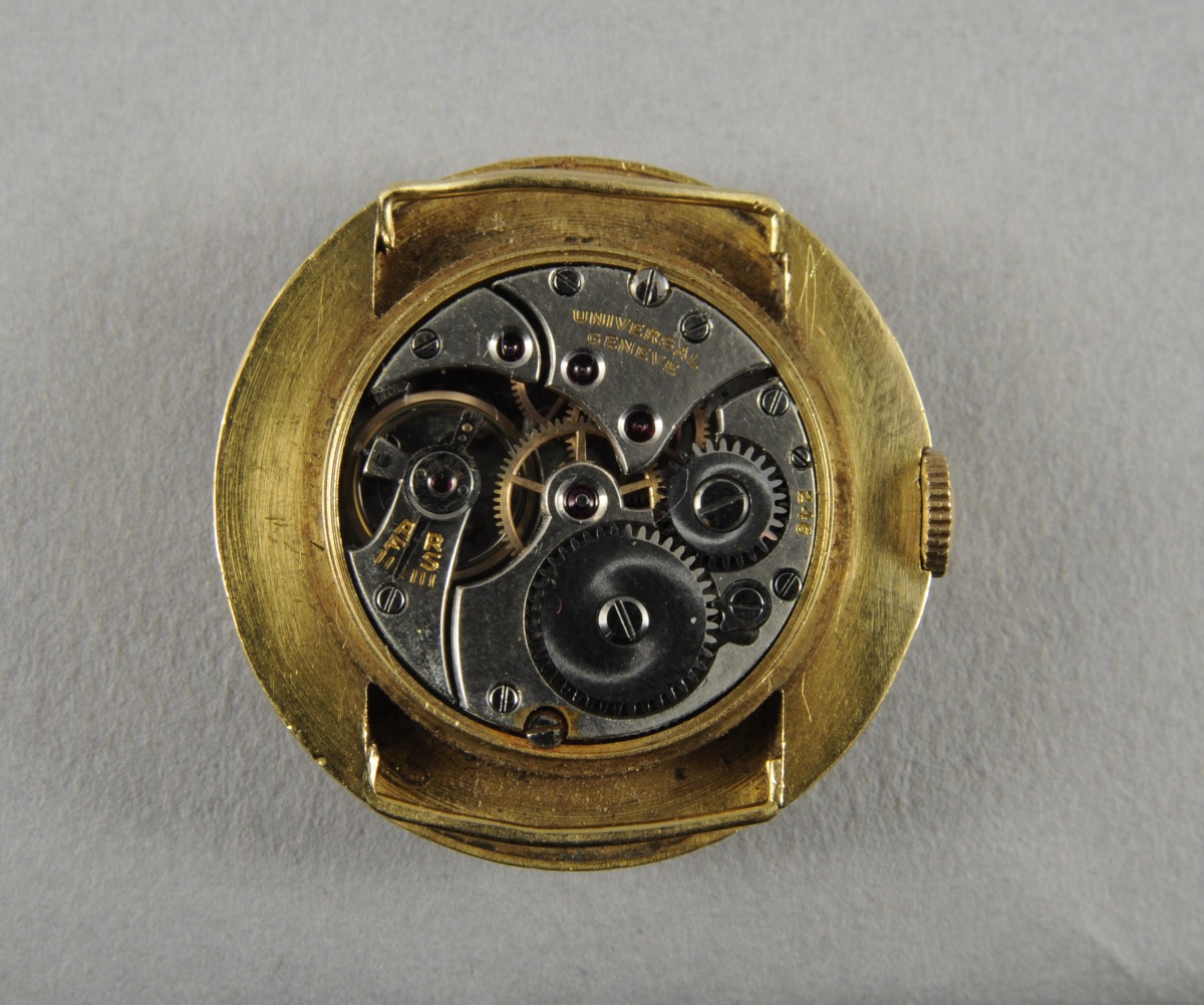 UNIVERSAL GENÈVE. MONTRE-BRACELET de forme ronde en or jaune. Cadran métallique indiquant les heures et les minutes par des cercles et des bâtonnets noirs. Signé. Aiguilles en acier bleui. Mouvement signé.