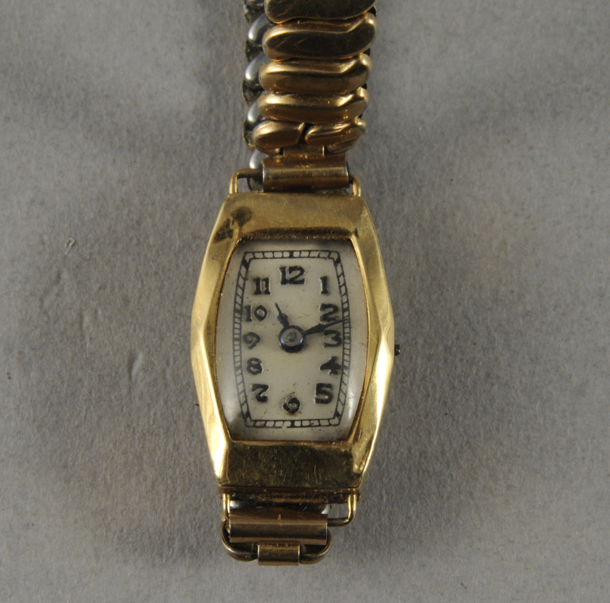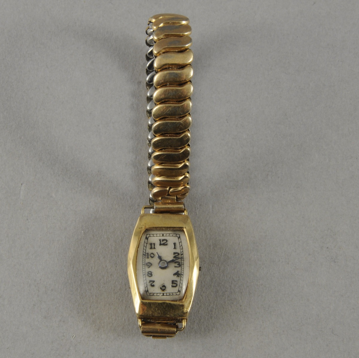 MONTRE BRACELET de dame. Le boîtier de forme rectangulaire en or. Bracelet articulé en métal.
