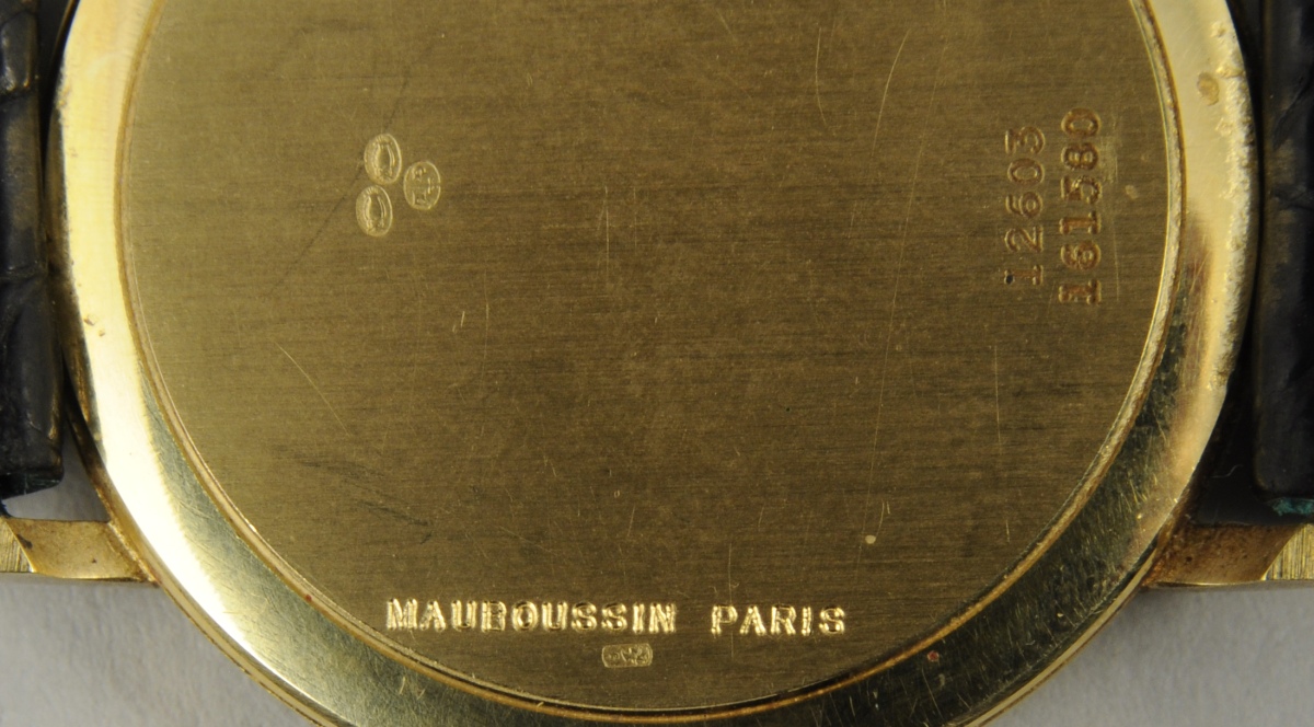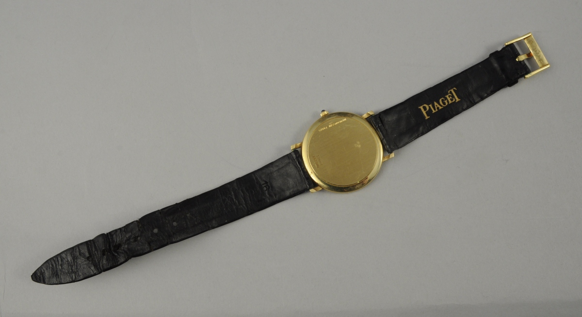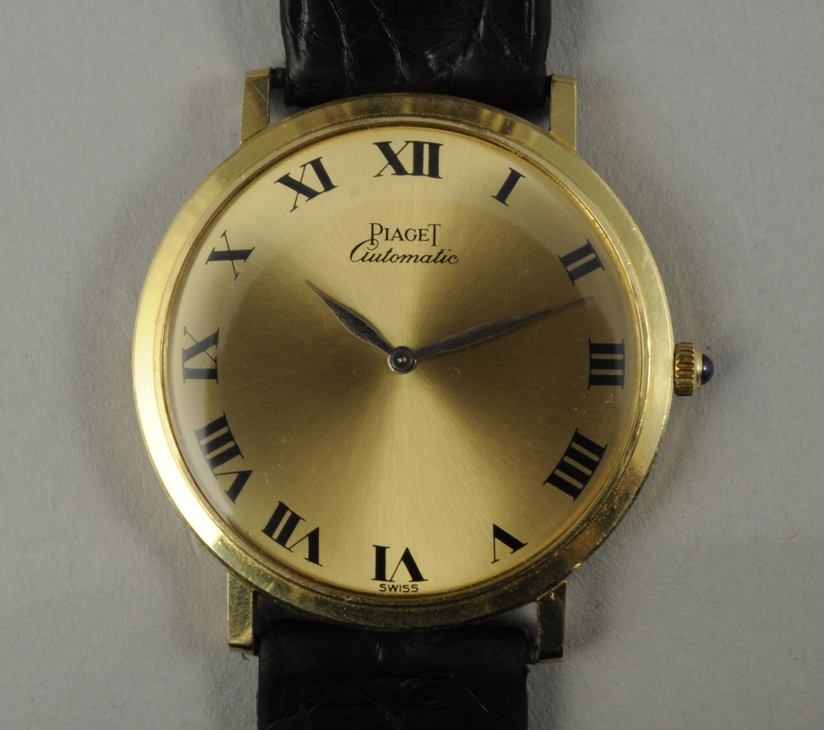 PIAGET. MONTRE-BRACELET AUTOMATIC d'homme en or. Cadran de forme circulaire doré indiquant les heures en chiffres romains. Signé. Référence "12603", "161580"; et signé "Mauboussin Paris" au verso. Bracelet en croco noir Piaget à boucle or, avec letttre P.