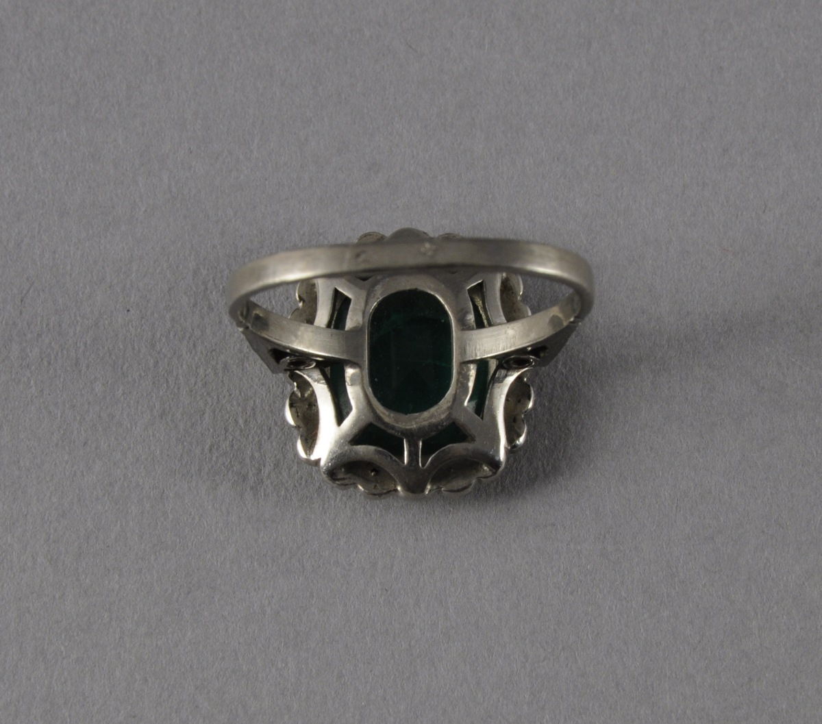 BAGUE en argent, sertie d'une pierre de synthèse verte dans un entourage de pierres de synthèse blanches.