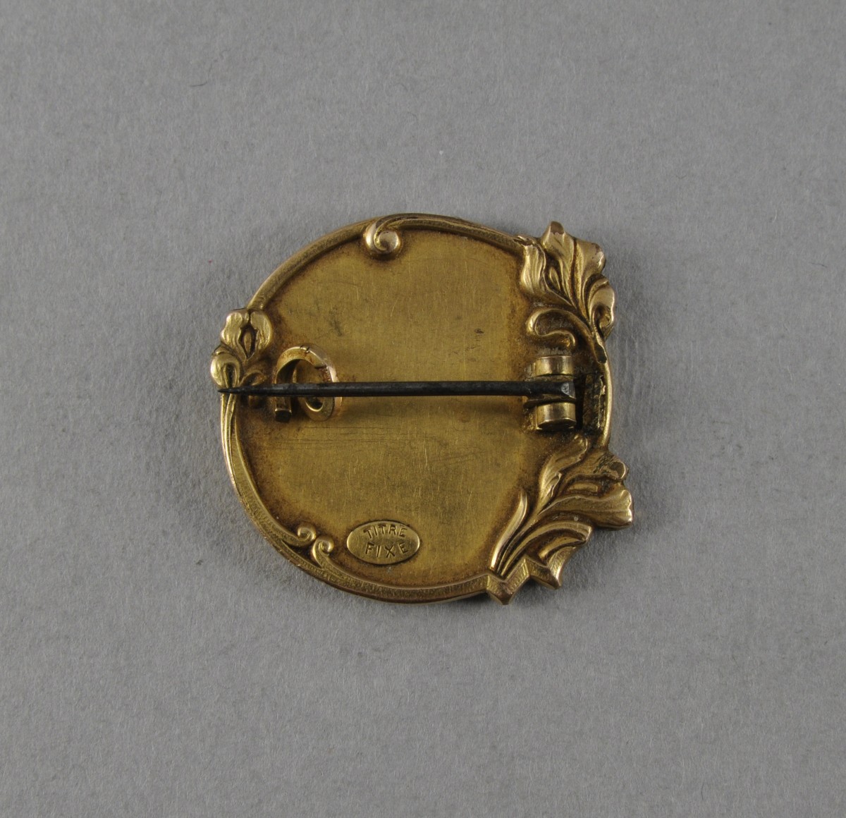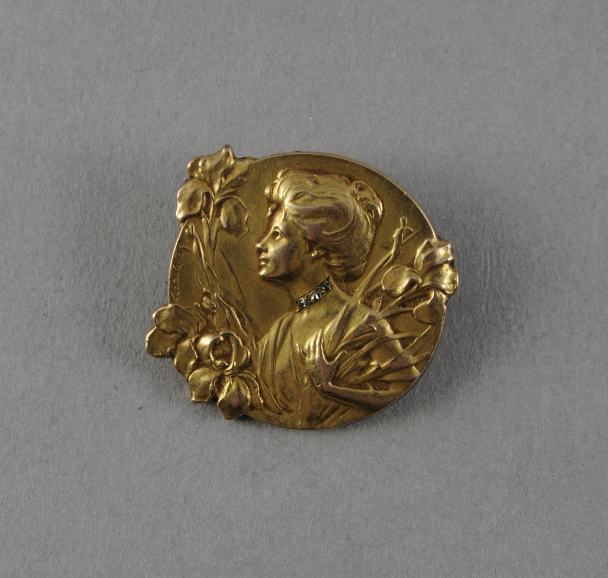 BROCHE ronde en or fixé à décor repoussé d'une jeune femme aux iris. Son collier serti de trois brillants ? Signée E. Dropsy. Art Nouveau. Poids brut : 4,2 g.