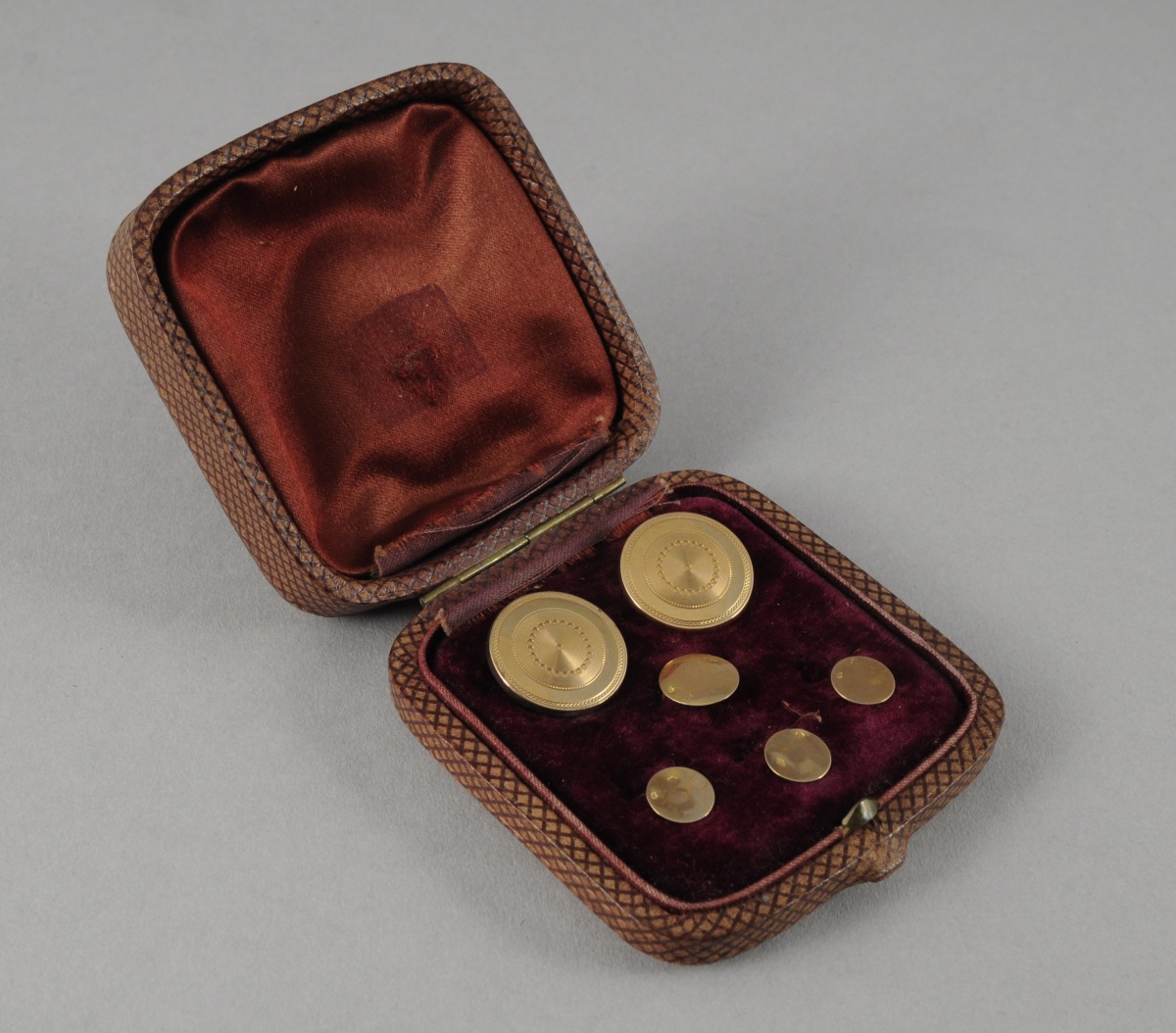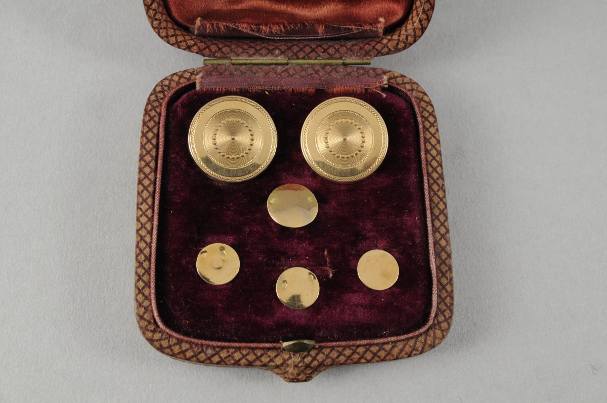 ENSEMBLE comprenant une PAIRE de BOUTONS de COL en or jaune guilloché à décor concentrique. Poinçon tête d'aigle. Diam. 2 cm. Poids : 4 g ; et QUATRE BOUTONS de COL en or jaune. Poinçon tête d'aigle. Poids : 2,5 g. Dans un écrin.