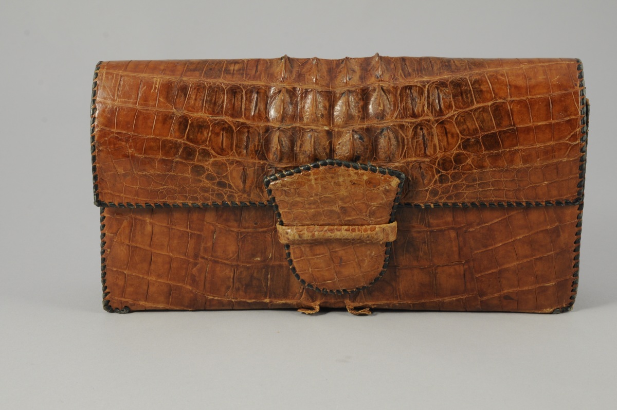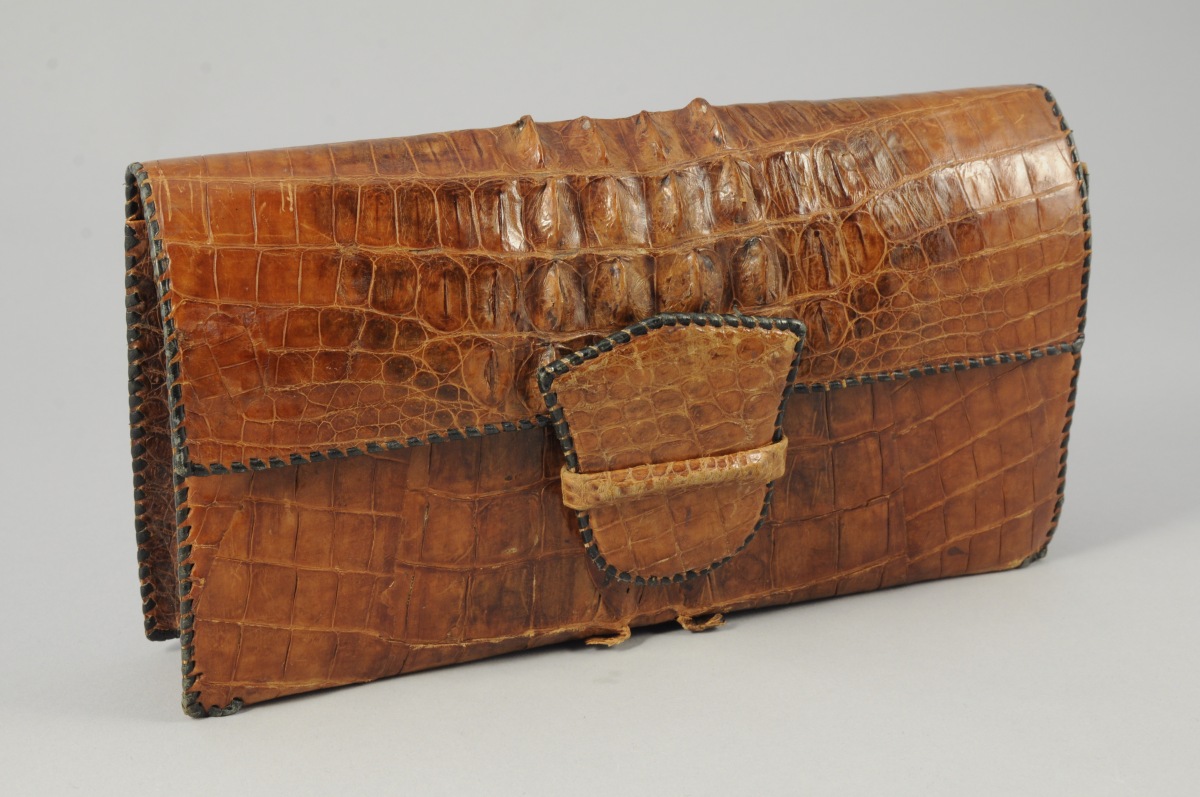 SAC DE SOIREE en crocodile brun, fermeture à glissière. Etat d'usage.
