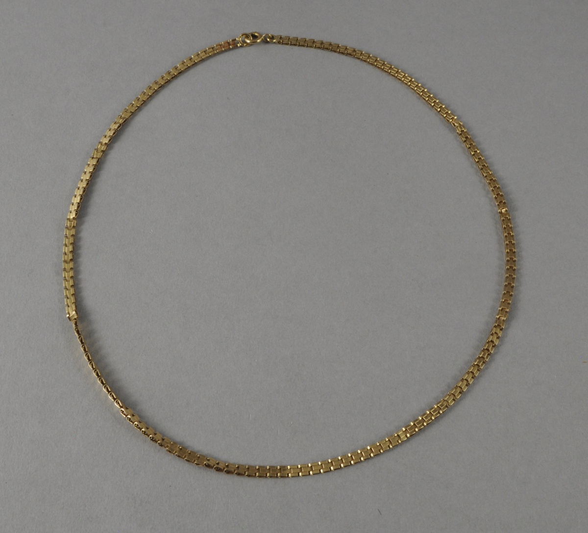 CHAÎNE en or jaune à mailles articulée. Poinçon tête d'aigle. Poids : 9 g. Long. 42 cm.