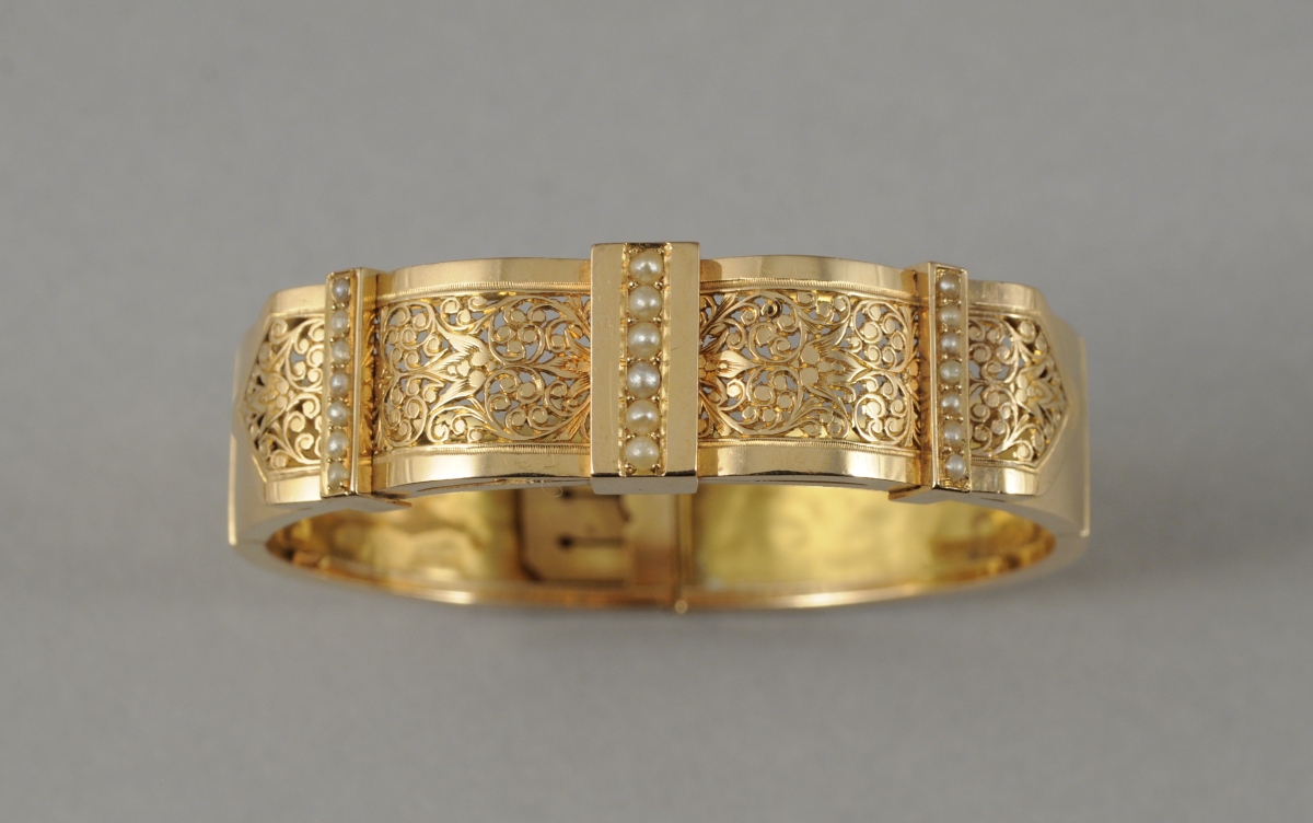 BRACELET rigide et ouvrant en or jaune partiellement ajouré, orné de trois lignes de demi-perles. (Bosses et accidents).