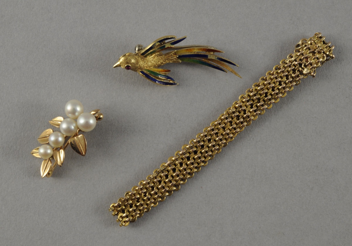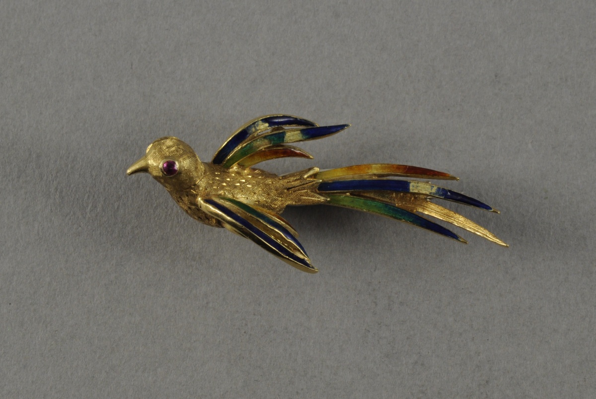 - BROCHE oiseau émaillée polychrome. L'oeil en pierre rose. Poinçon illisible. Poids brut : 6,4 g.