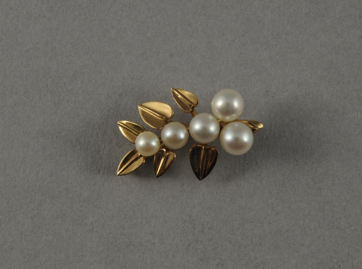 - BROCHE palme ornée de cinq perles de culture. Poids brut : 3,8 g.
