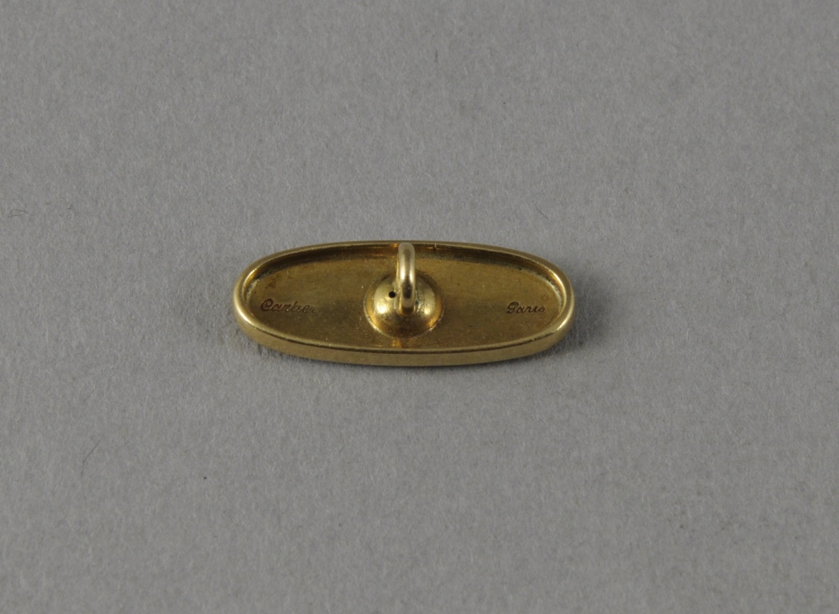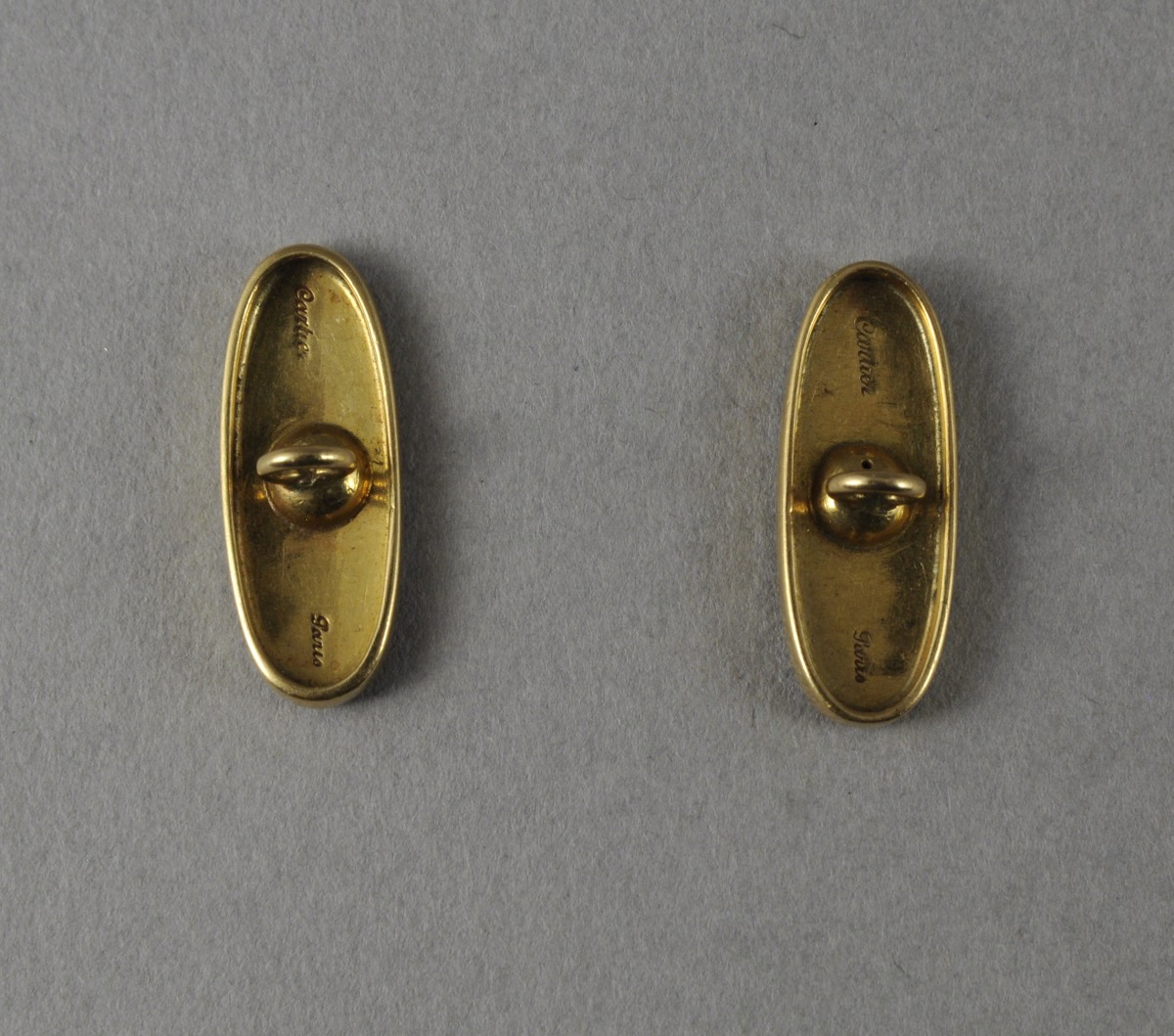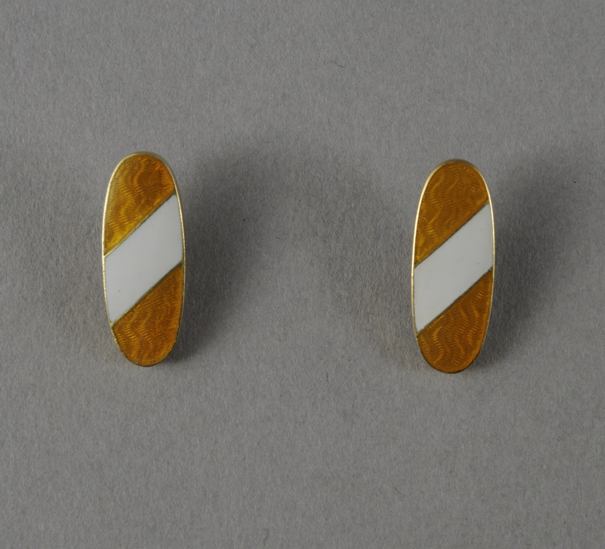 CARTIER PARIS. PAIRE de BOUTONS de MANCHETTES oblongs en or jaune émaillés de bandes jaunes et blanches. Signés. Haut. 2, Larg. 0,7 cm. Poids brut : 1,8 g.