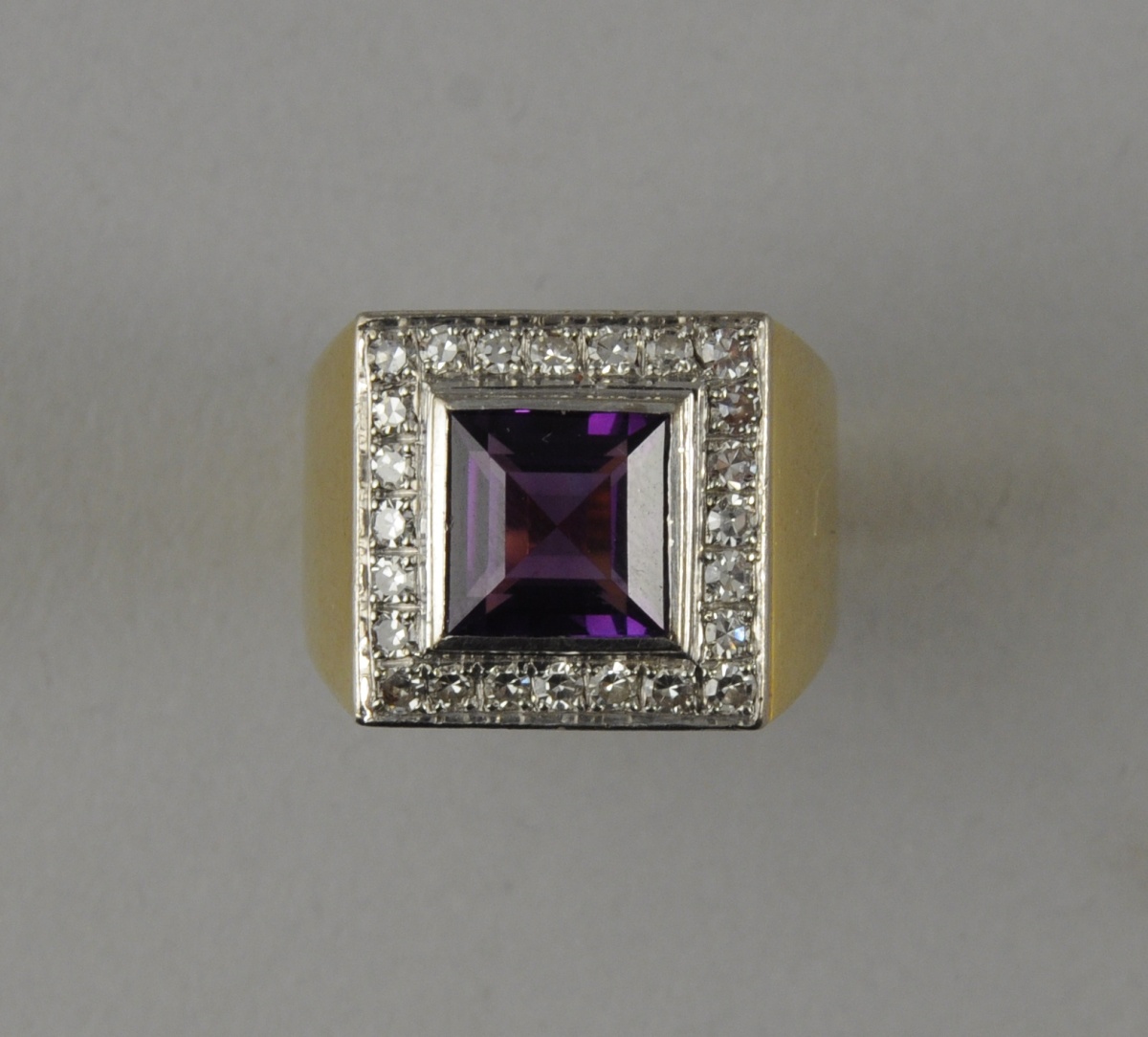 BAGUE en or jaune sertie d'une améthiste carrée dans un entourage de petits diamants. Poids brut : 15,8 g.