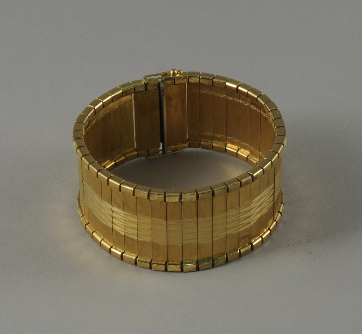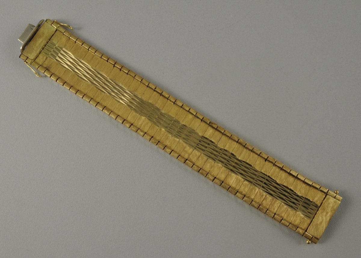 BRACELET de forme rectangulaire à maille souple en or. Il est orné d'une frise de losanges sur fond amati. Marqué "LPC" et "N°127- ?". Fermoir en or blanc probablement rapporté.