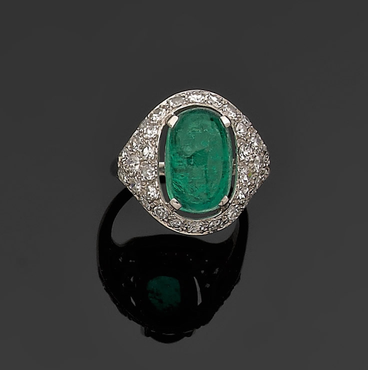 BAGUE boule en or gris ornée d'une émeraude cabochon dans un pavage de petits diamants ronds. Poids brut : 6 g. Tour de doigt : 50. (transformation possible)