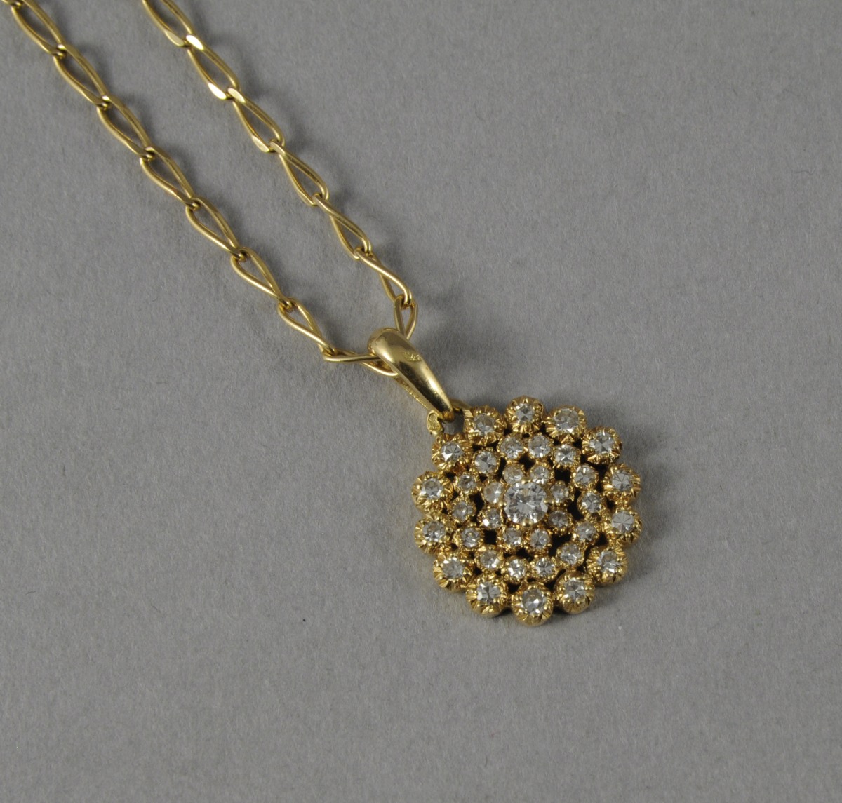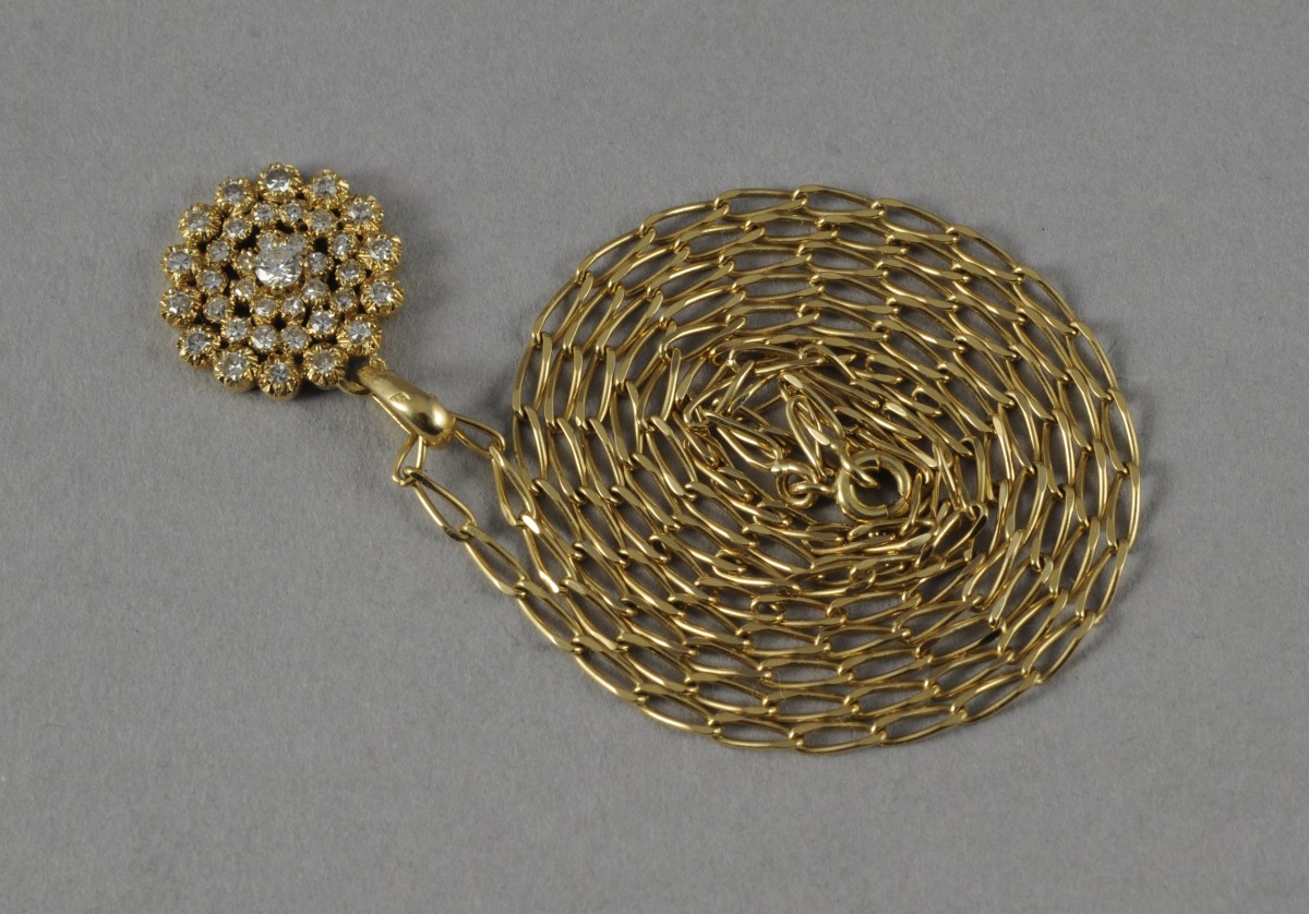 CHAINE maille forcat en or et son PENDENTIF en or formé de trois cercles sertis de 37 petites pierres blanches. Long. chaîne : 70 cm. Poids : 7,4 g. Poids brut du pendentif : 3,3 g.