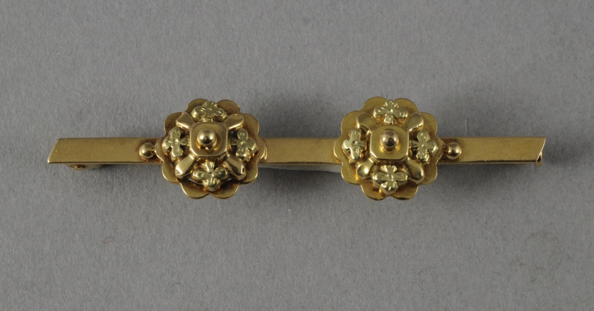 -BROCHE en or ornée de deux rosaces à décor trêflé associant or vert et jaune. Poids : 5 g.