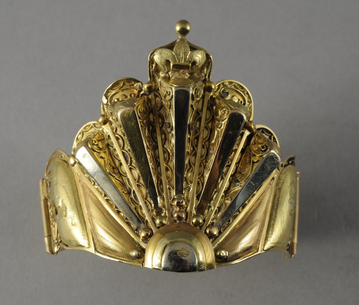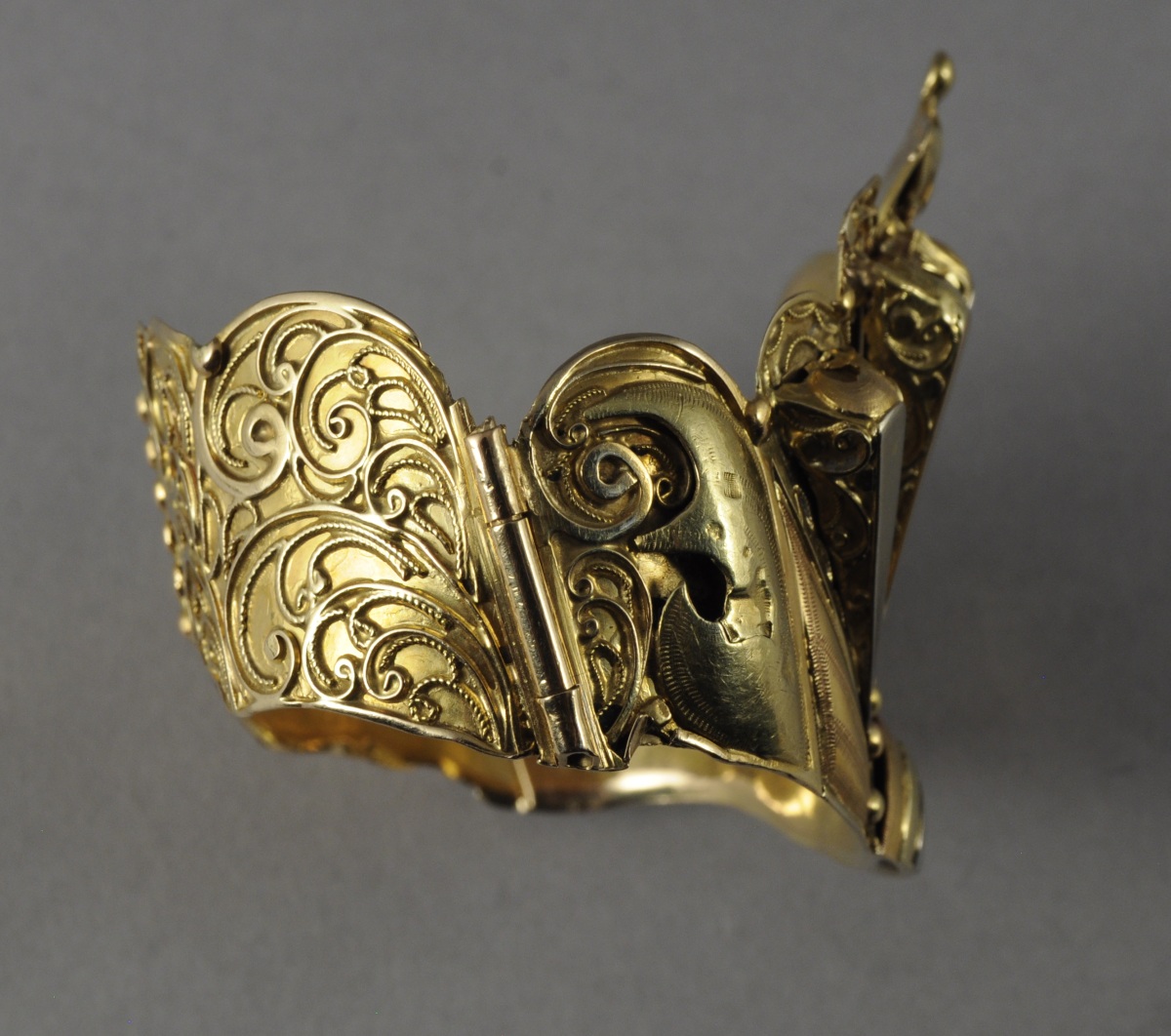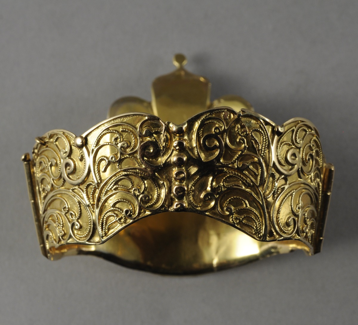 BRACELET manchette de forme mouvementée en or jaune à décor rayonnant agrémenté d'une fleur de lys et de rinceaux. Fermoir à glissière. Poids brut : 52,2 g.