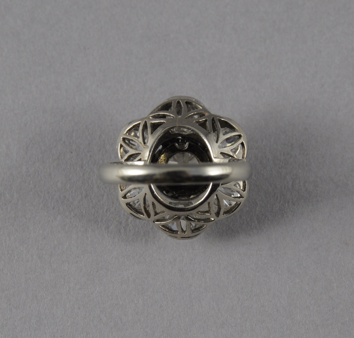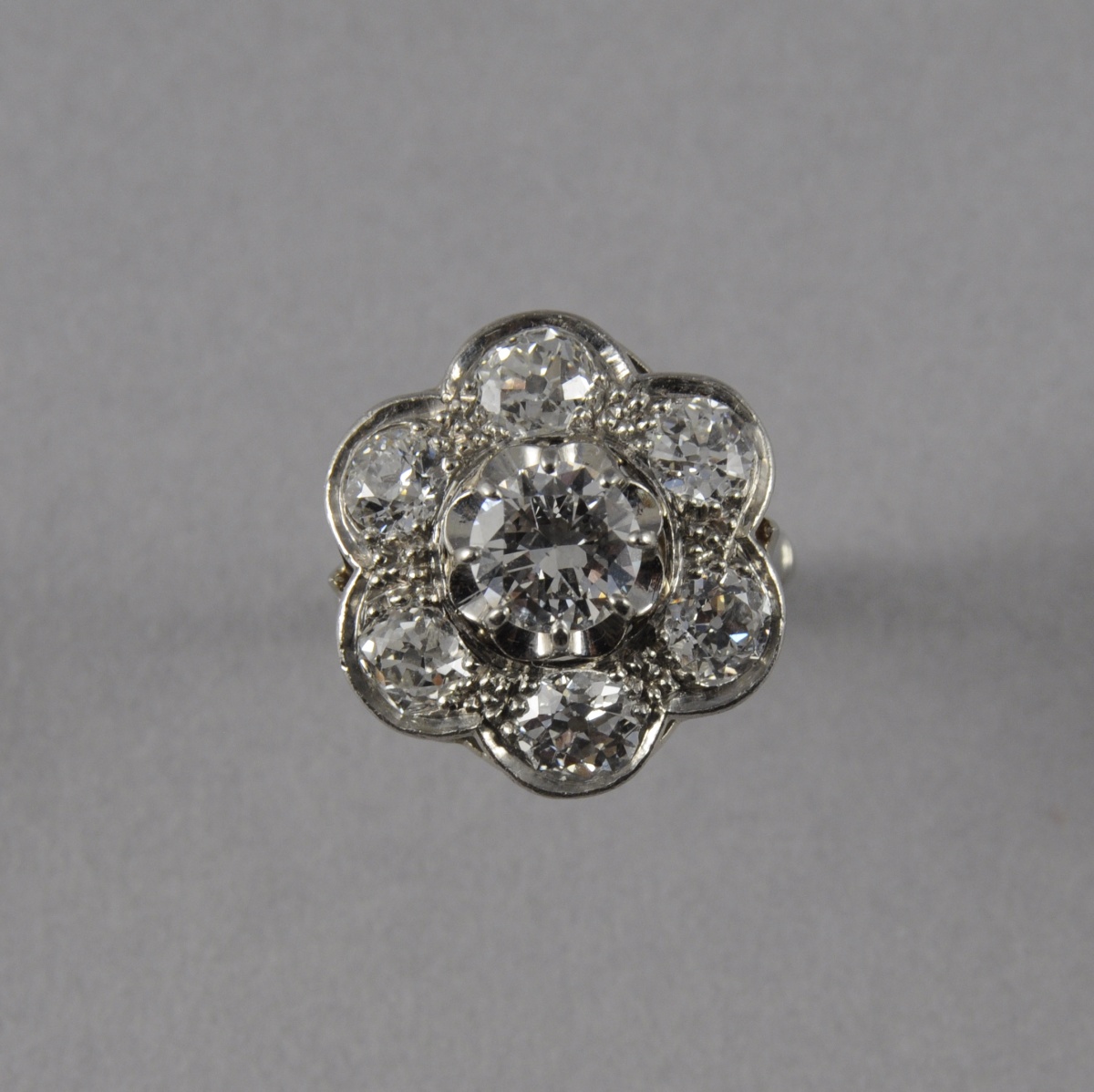 BAGUE en or gris, sertie au centre d'un diamant rond de taille brillant dans un entourage de six diamants ronds de taille ancienne.