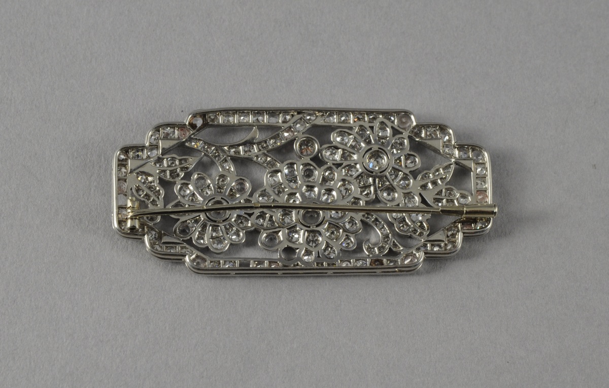 BROCHE rectangulaire en platine ajouré à décor de fleurs, entièrement pavée de pierres de synthèse blanches, de diamants ronds et d'onyx de forme triangulaire.