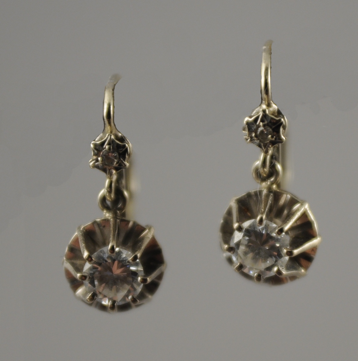 Paire de DORMEUSE en platine composée de deux diamants taille moderne, d'environ 0,4 ct chaque, et de deux brillants. Poids brut : 5 g. Long. 2 cm.