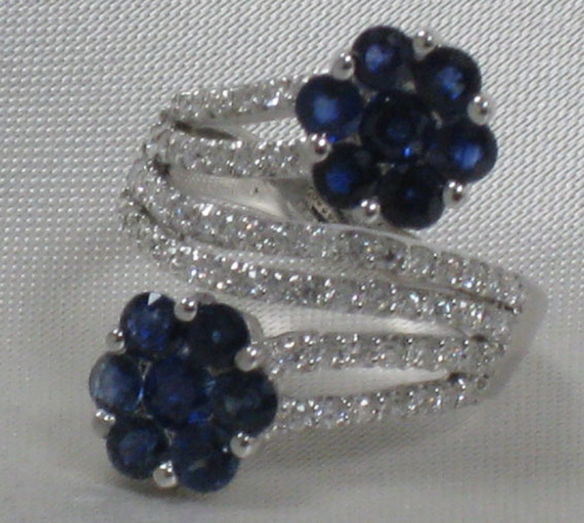 BAGUE ajourée "double-fleur" en or blanc ornée de 14 saphirs ronds de 1,95 carats environ et agrémentée de 63 diamants blancs de taille moderne de 0.5 carat environ.