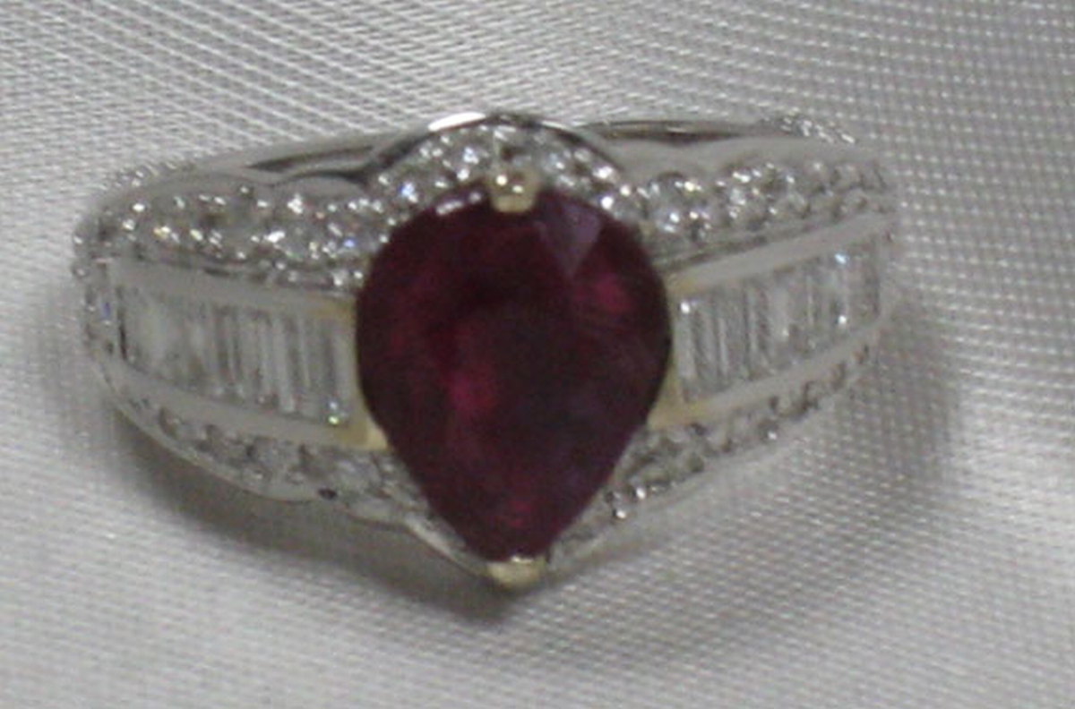 BAGUE en or blanc, ornée d'un rubis taille poire de 3 carats (probablement Birman) et agrémentée de 82 diamants blancs taille moderne de 0,95 carat et de 14 diamants blancs taille baguette de 0,45 carat environ.
