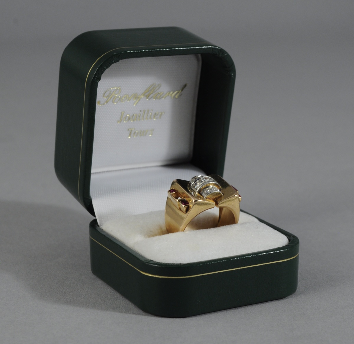 BAGUE TANK en or à trois rangs centraux de septs diamants et cinq rubis de part et d'autre (manque un rubis). Travail français vers 1943 à charge de contrôle. Poids brut 9 g.