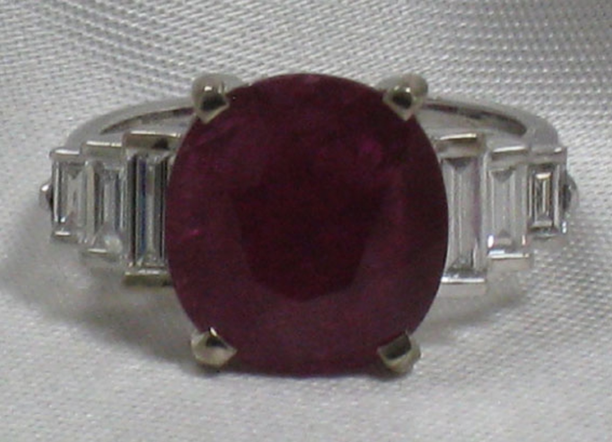 BAGUE en or blanc ornée d'un rubis taille ovale 5,1 carats environ et agrémentée de six diamants blancs taille baguette de 0,5 carat environ.