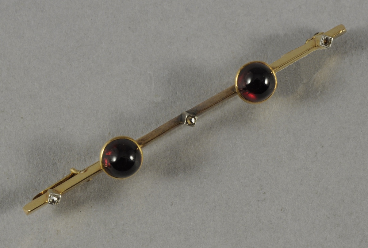 BROCHE en or sertie de deux cabochons ronds de grenat alternants avec trois pierres.