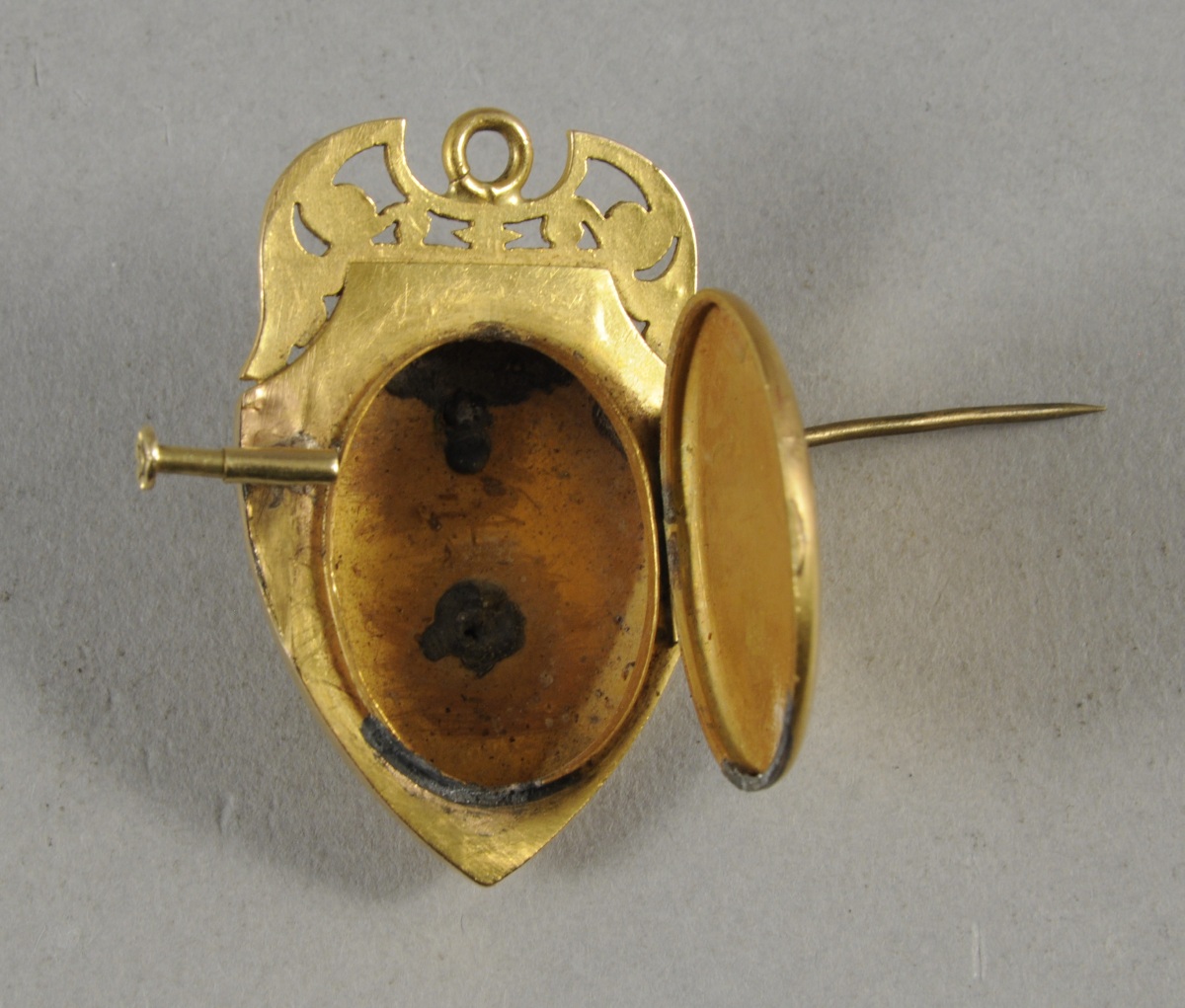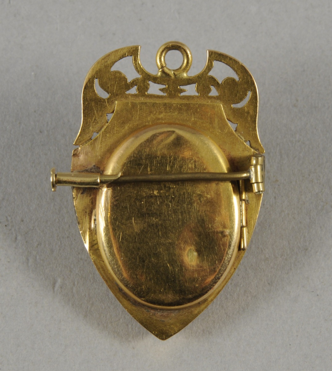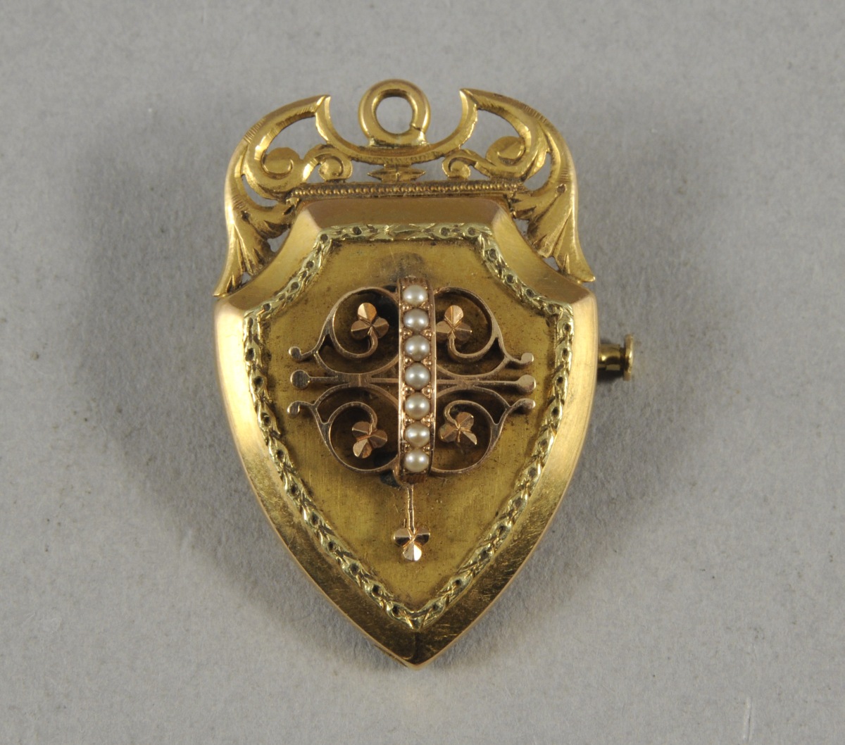 BROCHE RELIQUAIRE formant pendentif en forme d'écu en or de trois tons. Elle est ornée, au centre, de volutes à enroulements terminés par un trèfle et d'une barette sertie de sept demi-perles. Une frise de feuillages suit les contours de l'écu. L'anneau d'attache flanqué de volutes et de rinceaux feuillagés. Fin XIXème, début XXème.