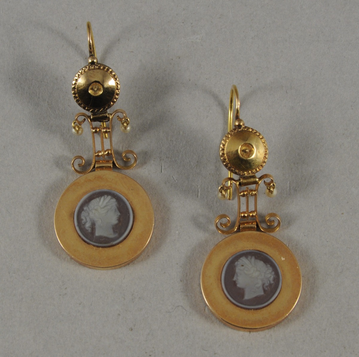 PAIRE DE PENDANTS D'OREILLE en or jaune retenant un camée sur cornaline de forme ronde figurant un profil de femme à l'Antique. Le bouton à contours guillochés, l'élément intermédiaire ajouré orné d'enroulements retenant deux petites perles blanches. Poinçon tête d'aigle. Style Empire, seconde moitié du XIXème.