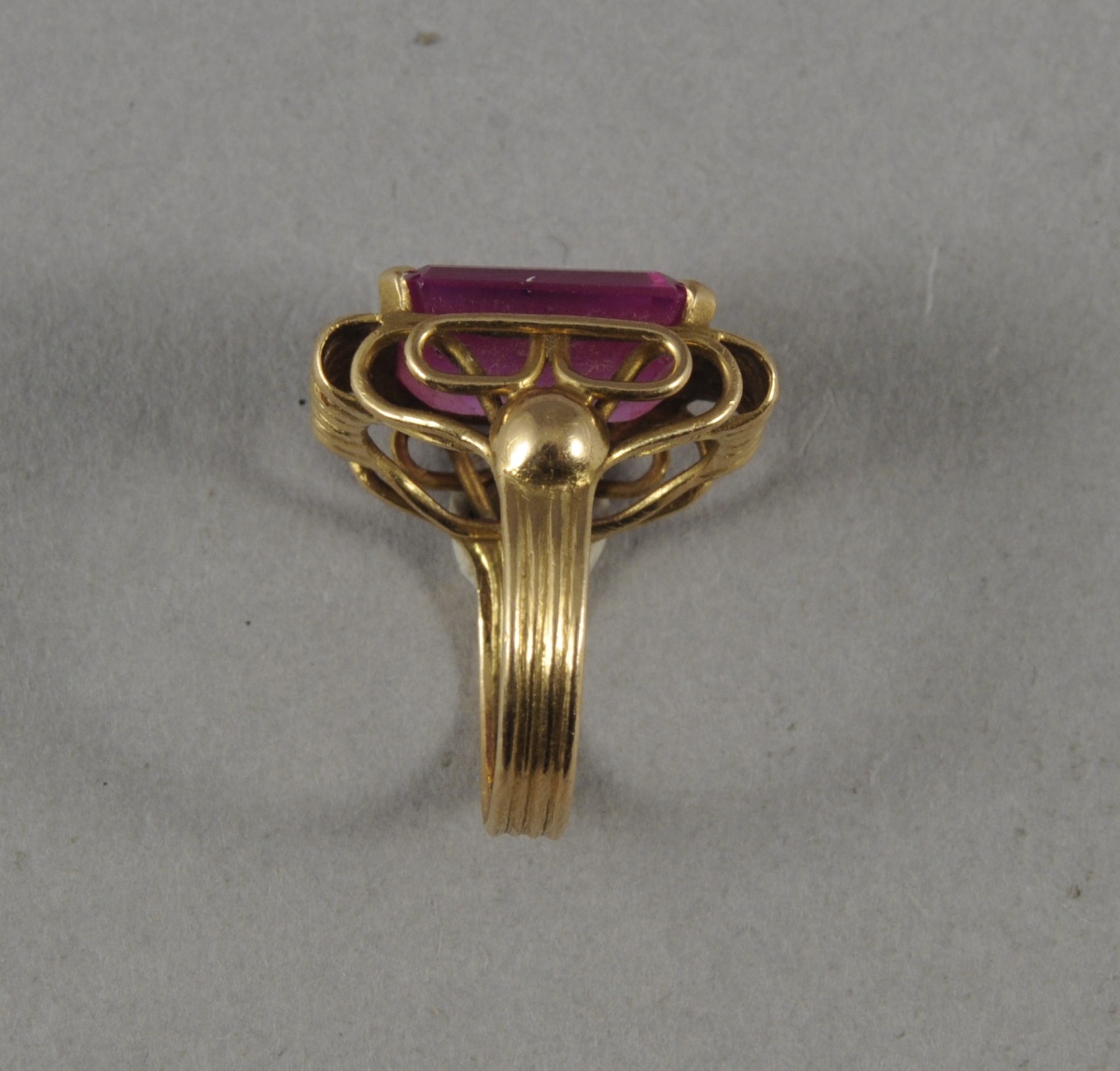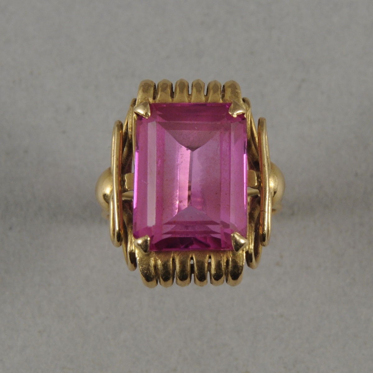 BAGUE en or jaune sertie d'une pierre rose taille émeraude. La monture ajourée à décor de godrons, agrafes et d'une hémisphère à l'épaulement. Anneau cannelé. XXème.