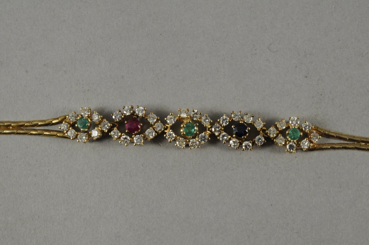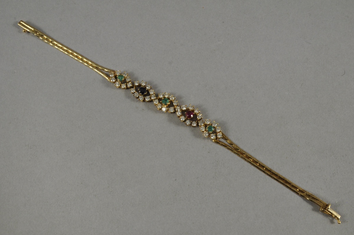 BRACELET en or jaune à maille articulée Il est orné de cinq motifs de forme navette aux contours sertis, au total, de 42 petits brillants. Trois de ces motifs sont centrés d'une petite émeraude, un d'un petit rubis et le dernier d'un petit saphir. Poinçon hexagonal marqué "750". Travail probablement italien du XXème.