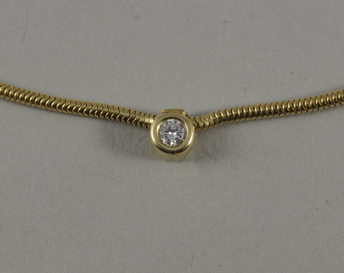 CHAÎNE maille serpent. Elle est agrémentée d'un pendentif de forme circulaire orné en serti clos d'un petit diamant de 0,10 carat environ. Long. 44,5 cm. Poids brut : 6,3 g.