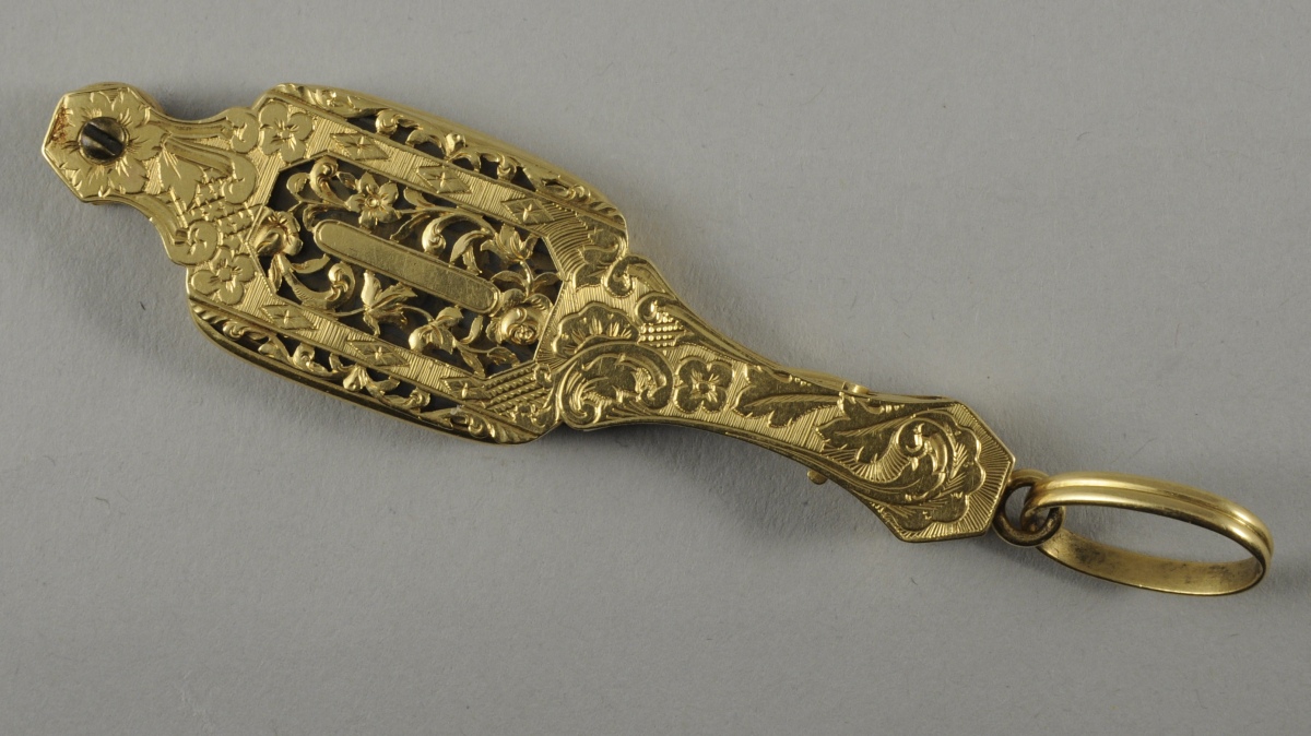 BINOCLES de poche en or. L'étui à riche décor floral ajouré tel que : feuilles d'acanthe stylisées et quadrillages dans le goût rocaille. Un système permet, en pressant une petite gachette, de déployer les lunettes. Seconde moitié du XIXème.
