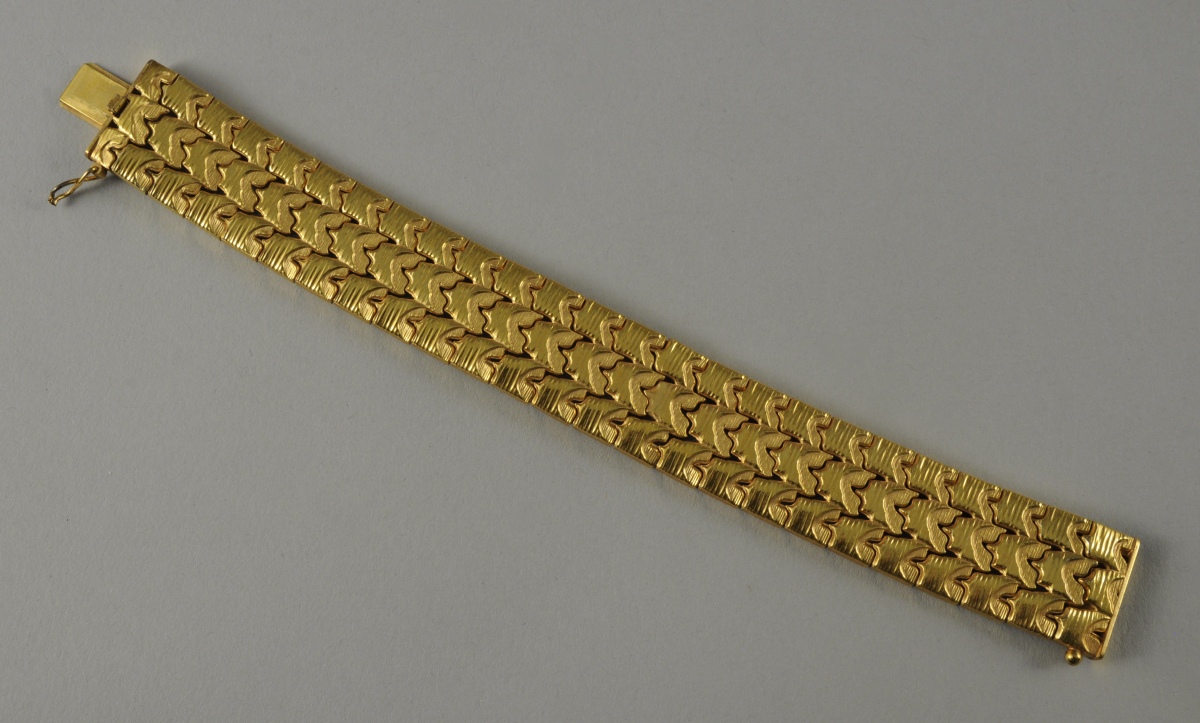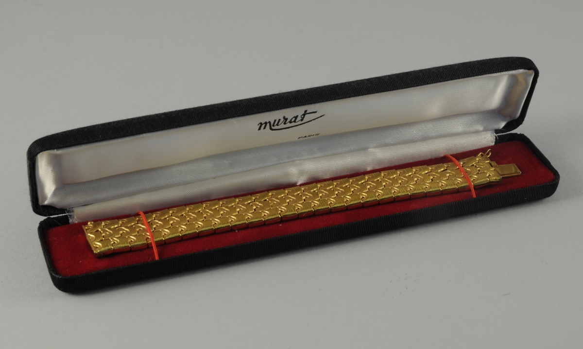 BRACELET de forme rectangulaire à maille souple en métal doré. Décor brillant et amati de crêtes de vague. Signé Murat. Dans son écrin. (à charge de contrôle)