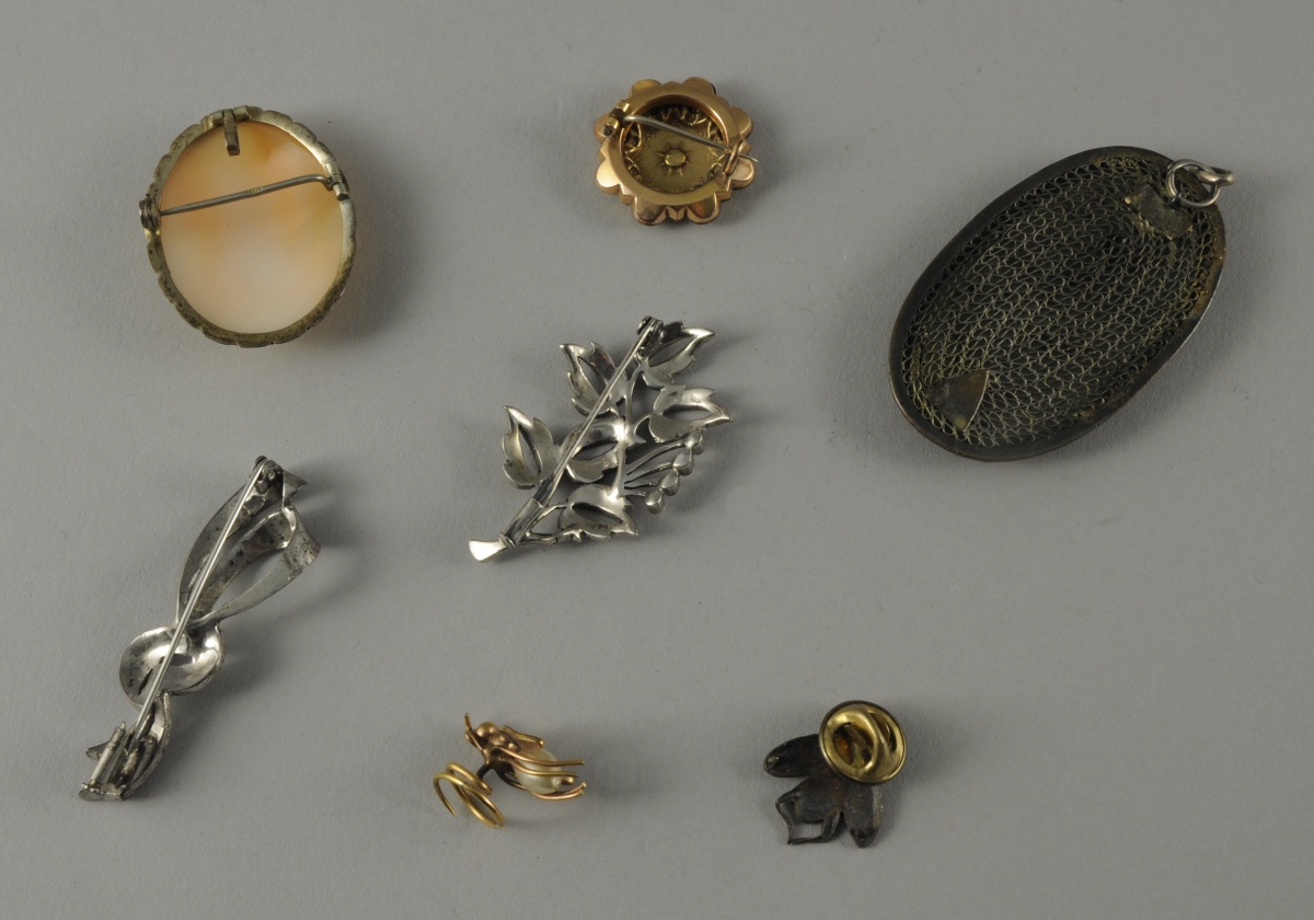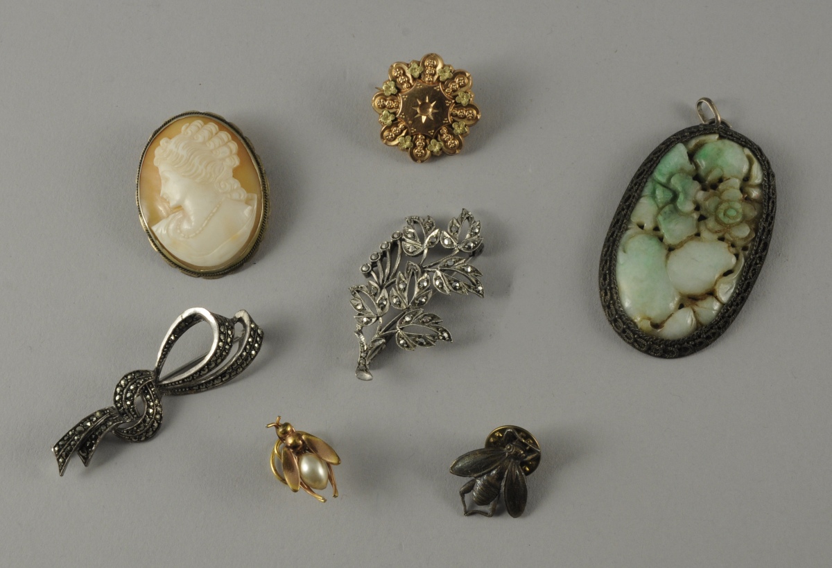 LOT DE BIJOUX FANTAISIE comprenant une broche camée coquille figurant une femme en buste de profil, un pendentif en jade sculpté et ajouré de feuillages stylisés, une broche en argent figurant une branche d'arbre feuillue sertie de petites pierres facetées, une broche en argent figurant un ruban noué serti de petites pierres facetées, une broche adoptant la forme d'un fleuron en or fixé, un bouton de manchette figurant une guêpe en métal doré, un pin's figurant une abeille en argent.