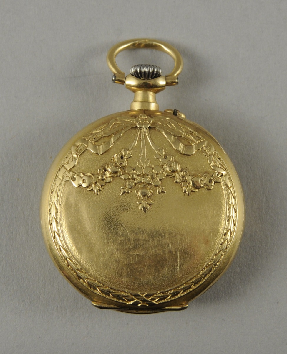 MONTRE DE COL à remontoir au pendant, en or jaune décoré de fleurs.