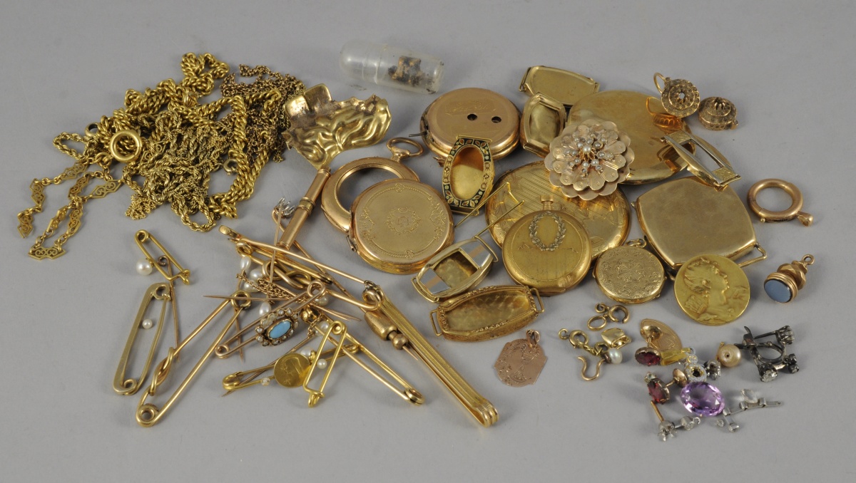 29 ÉLÉMENTS en or (?) broche, boîtiers de montres, or dentaire... Poids brut : supérieur à 60 g.