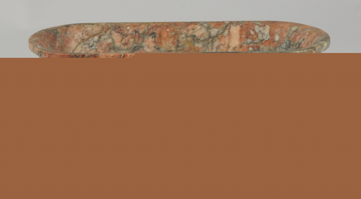 VIDE-POCHE figurant une BAIGNOIRE À L'ANTIQUE en marbre veiné rose et vert (porphyre ?), reposant sur quatre pieds griffes sur un socle rectangulaire de marbre vert.