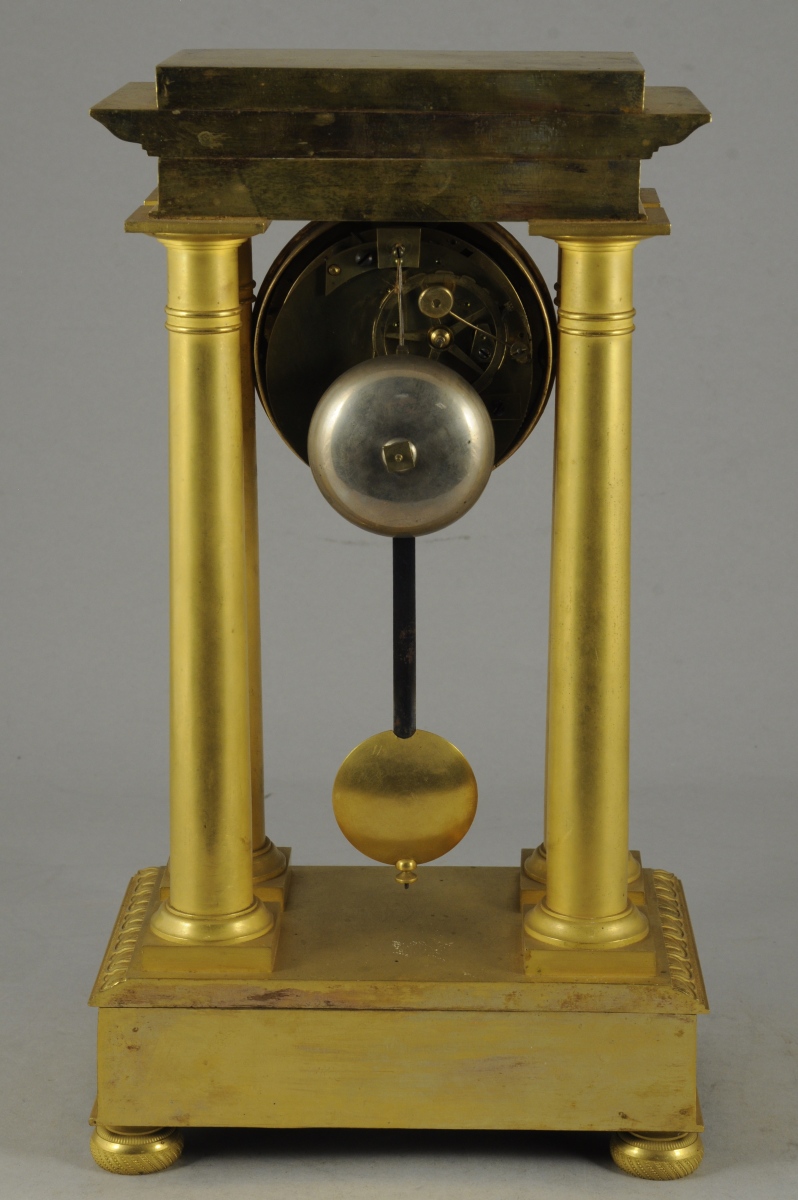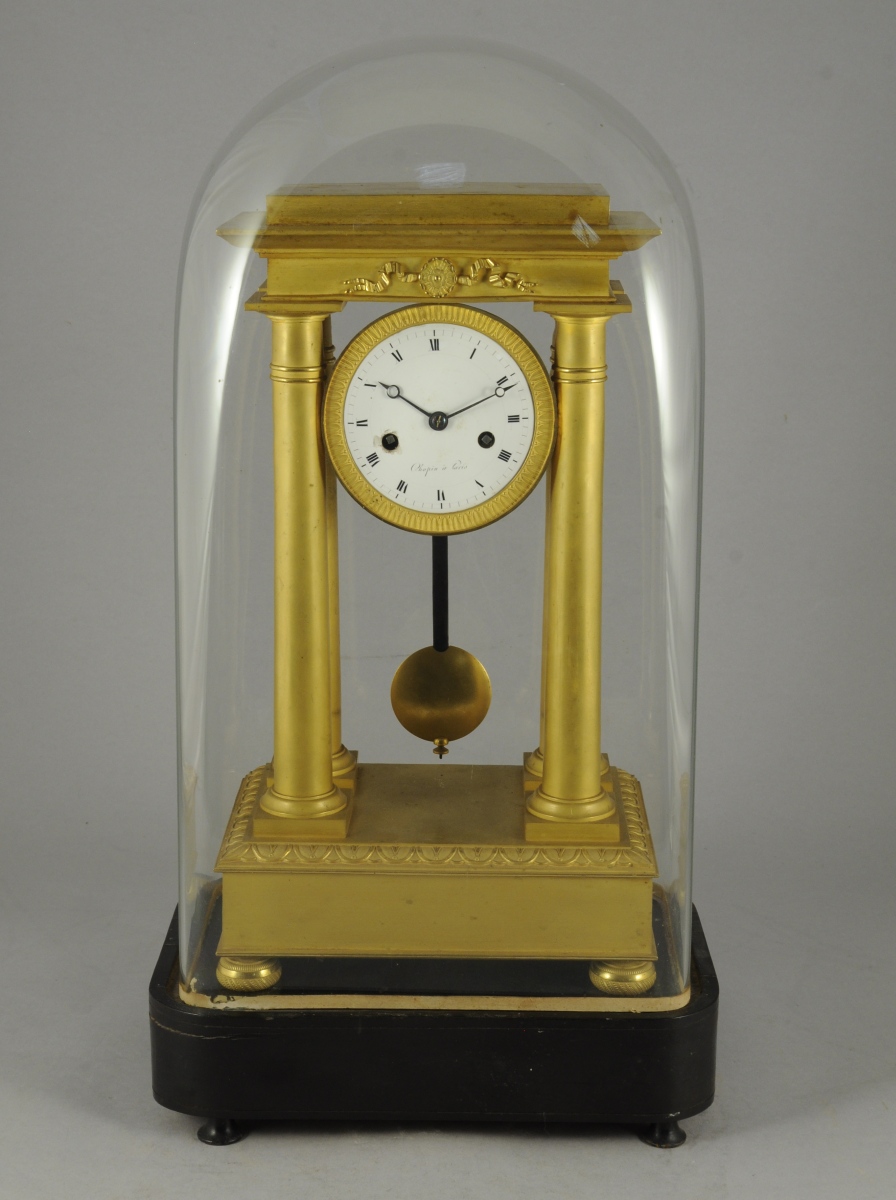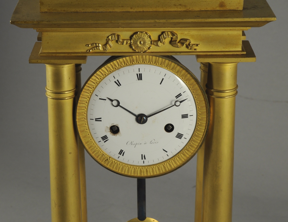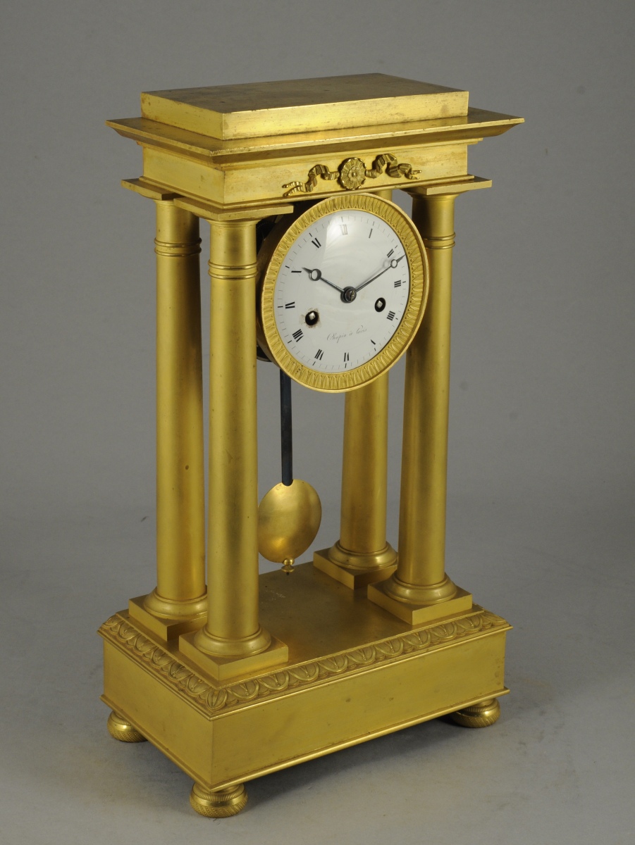 PENDULE PORTIQUE en bronze ciselé et doré. La base quadrangulaire ornée d'une frise de feuilles d'eau supporte quatre colonnes d'ordre dorique. Entablement et fronton centré d'une fleurette rubanée. Repose sur quatre pieds en boule aplatie. Cadran émaillé blanc indiquant les heures en chiffres romains signé "Chopin à Paris".
