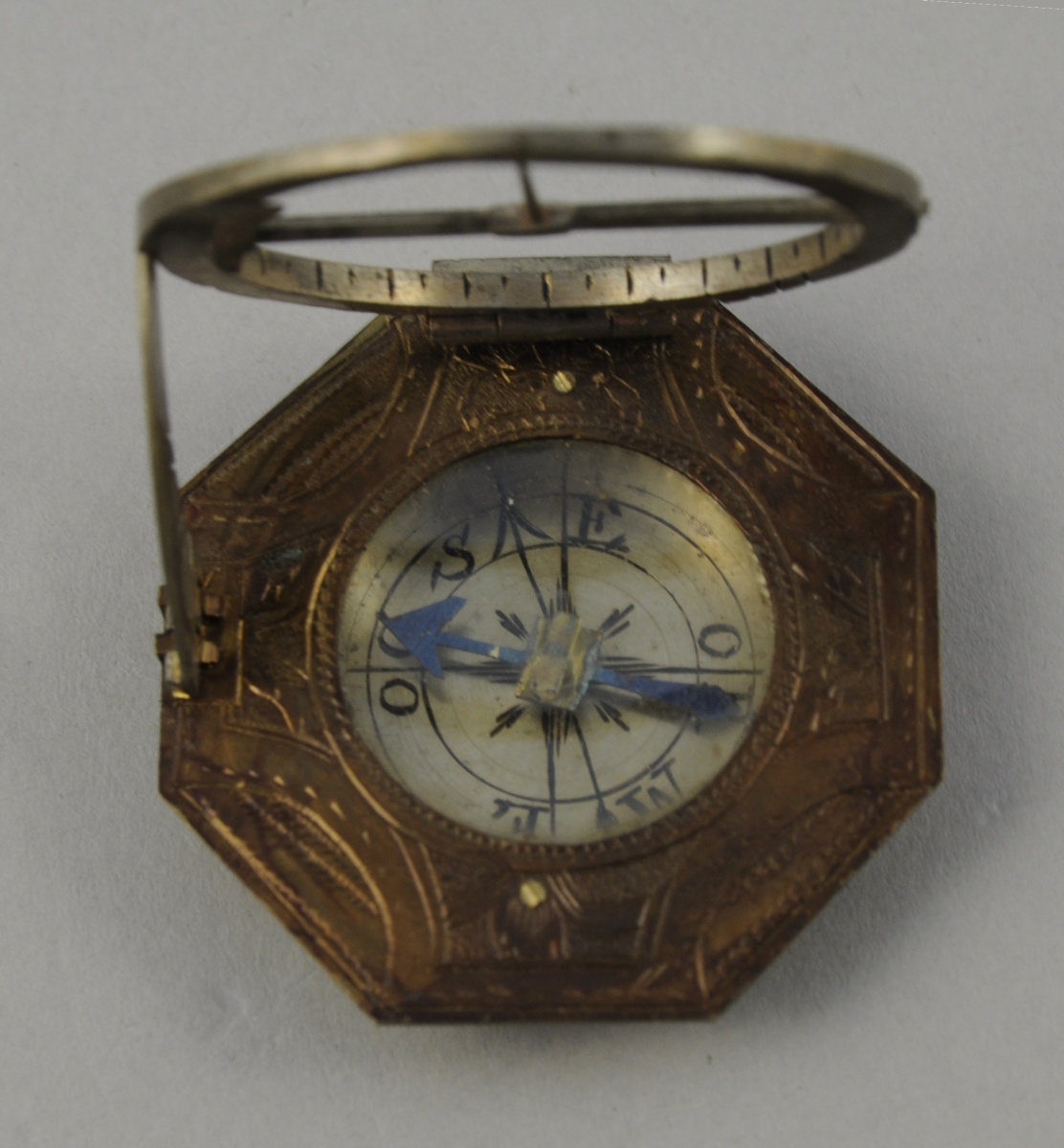COMPAS SOLAIRE horizontal de forme octogonale en laiton. Signé "Johann Schrettegger in Augsb." Avec sa notice d'utilisation en allemand et en français comprenant également un tableau des principales latitudes urbaines. Etui en carton gainé de cuir.