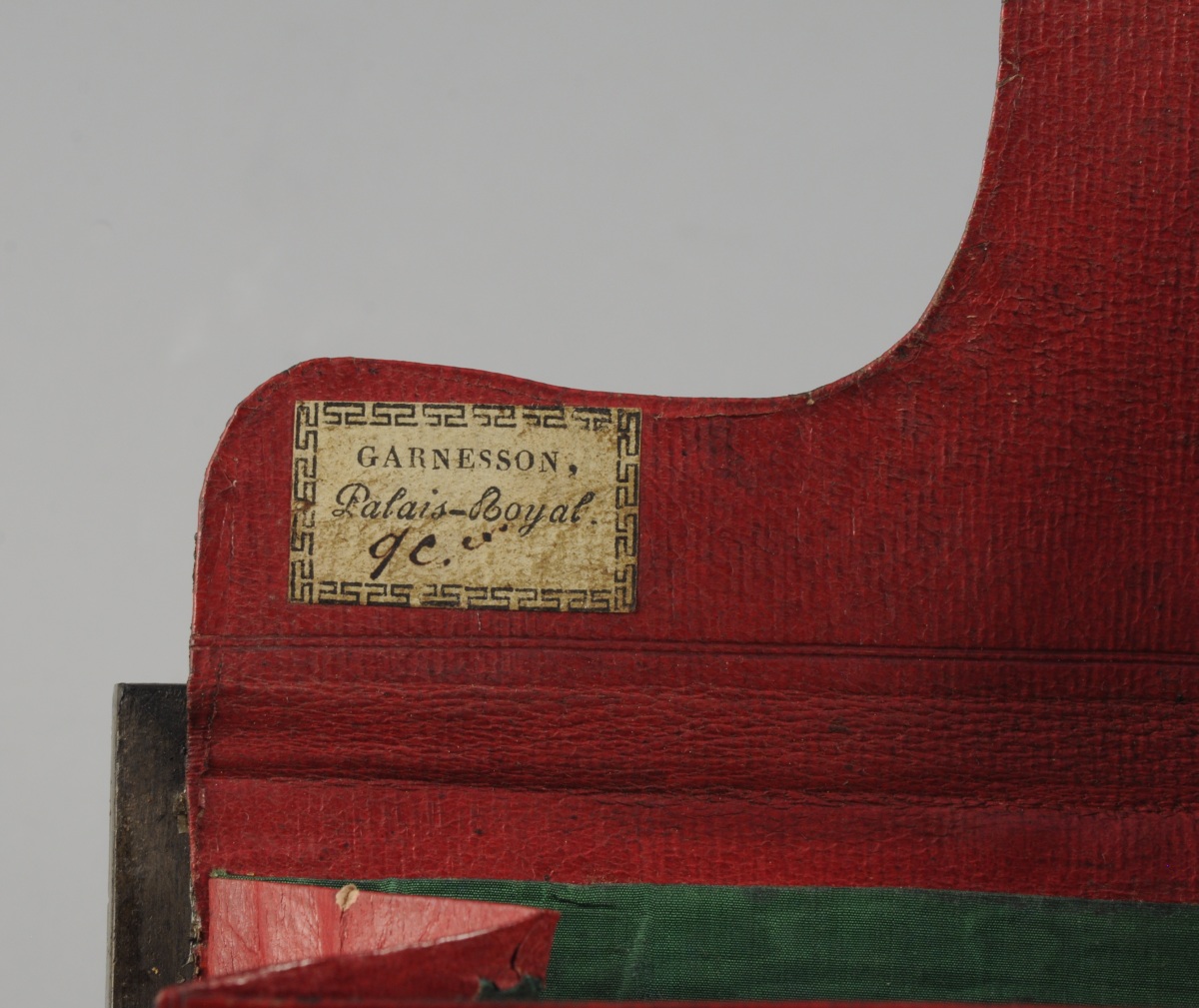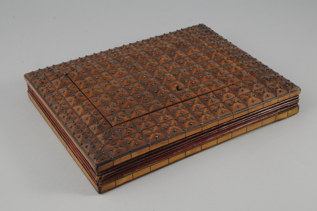 Long. 27, Larg. 20, Prof. (vide) 3,5, Prof. (soufflet déplié) 12,5 cm. (petits accidents et manques, clé manquante)
