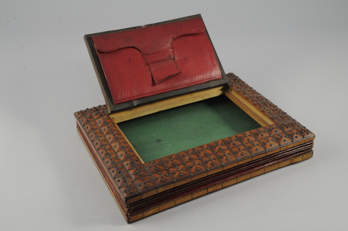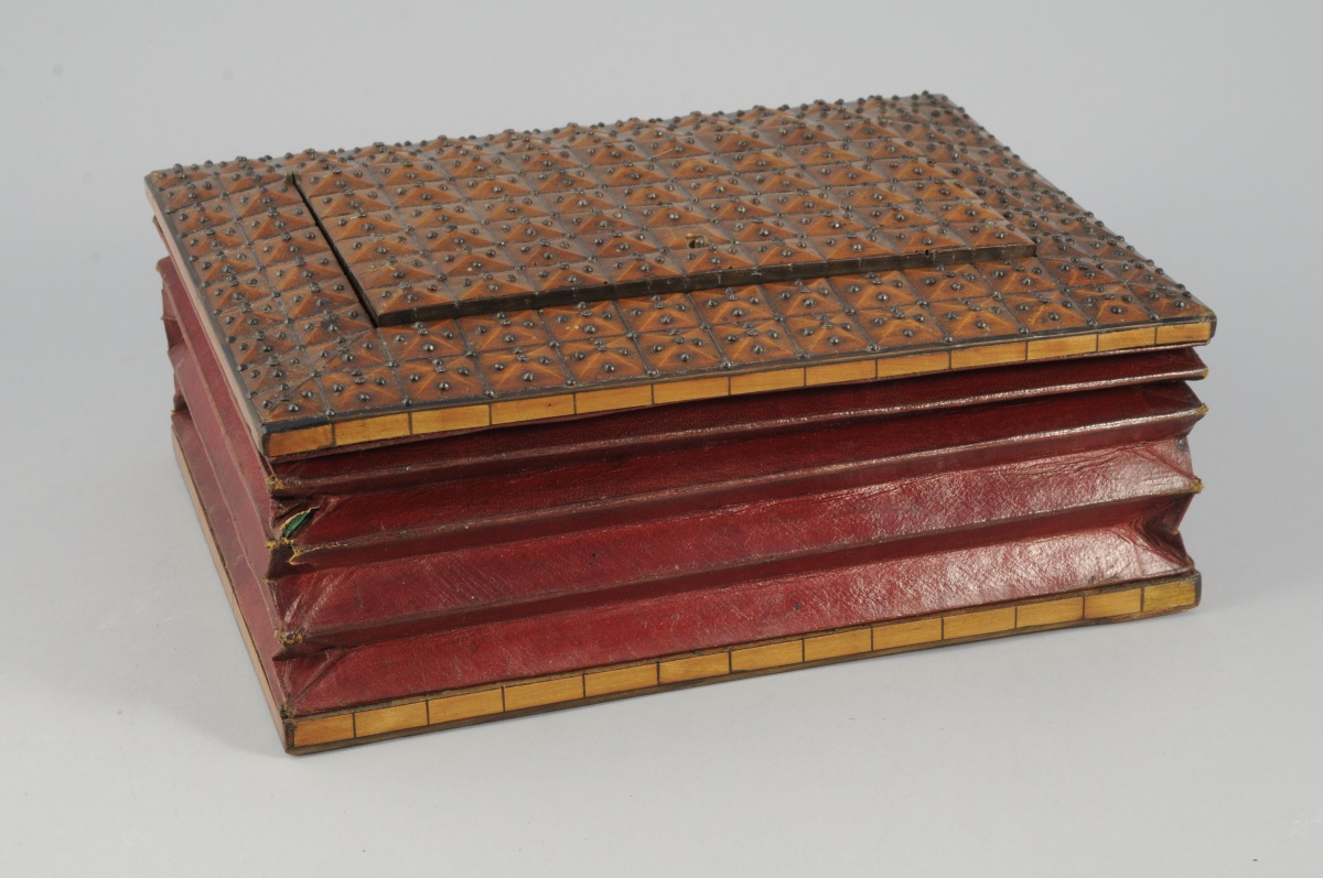 COFFRET à COURRIER à soufflet en citronnier sculpté de pointes de diamants clouées et orné de filets de bois noirci. Le soufflet en maroquin rouge. L'ouverture découvre une pochette en maroquin rouge. L'intérieur garni de tissu moiré vert. Marqué " Garnesson Palais royal ".
