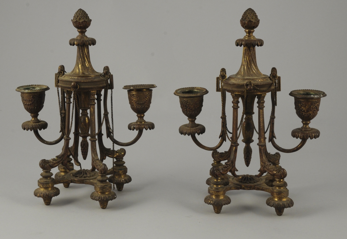 Petite GARNITURE DE CHEMINEE en bronze doré, composée d'une pendule à poser et d'une paire de flambeaux à deux lumières. Riche ornementation de cassolette, pommes de pin, rangs de perles, fleurs de lotus et feuillages. Cadran émaillé signé "Susse Fres Paris". Mouvement monogramé "H&F Paris" et numéroté 2437 et 86.