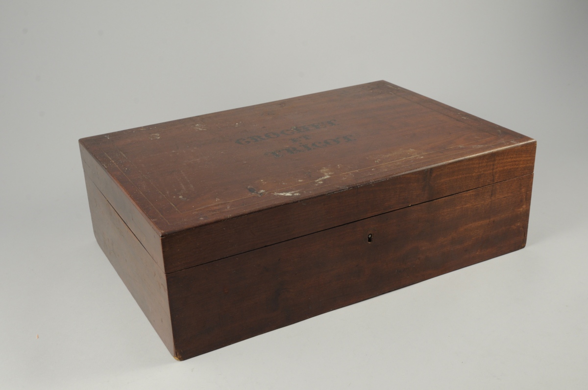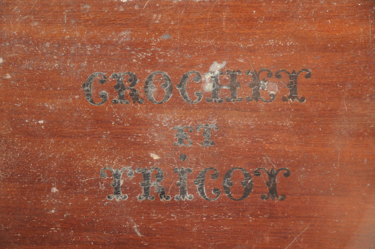 JOINT : BOÎTE rectangulaire en acajou. Marquée sur le dessus "CROCHET ET TRICOT". Fin XIXème-début XXème. Haut. 13, Larg. 41,5, Prof. 28 cm. (usures, manque la clé)