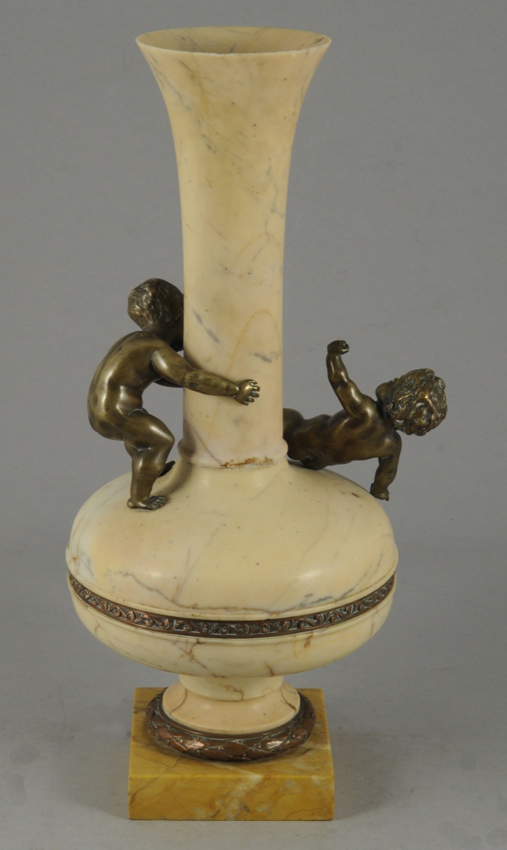 VASE en marbre beige, sur piédouche à panse et col tubulaire évasé. Repose sur une base carrée en marbre jaune. Deux amours en bronze prés du col, cerclage et base bronze à décor néo-classique de style XVIIIème.